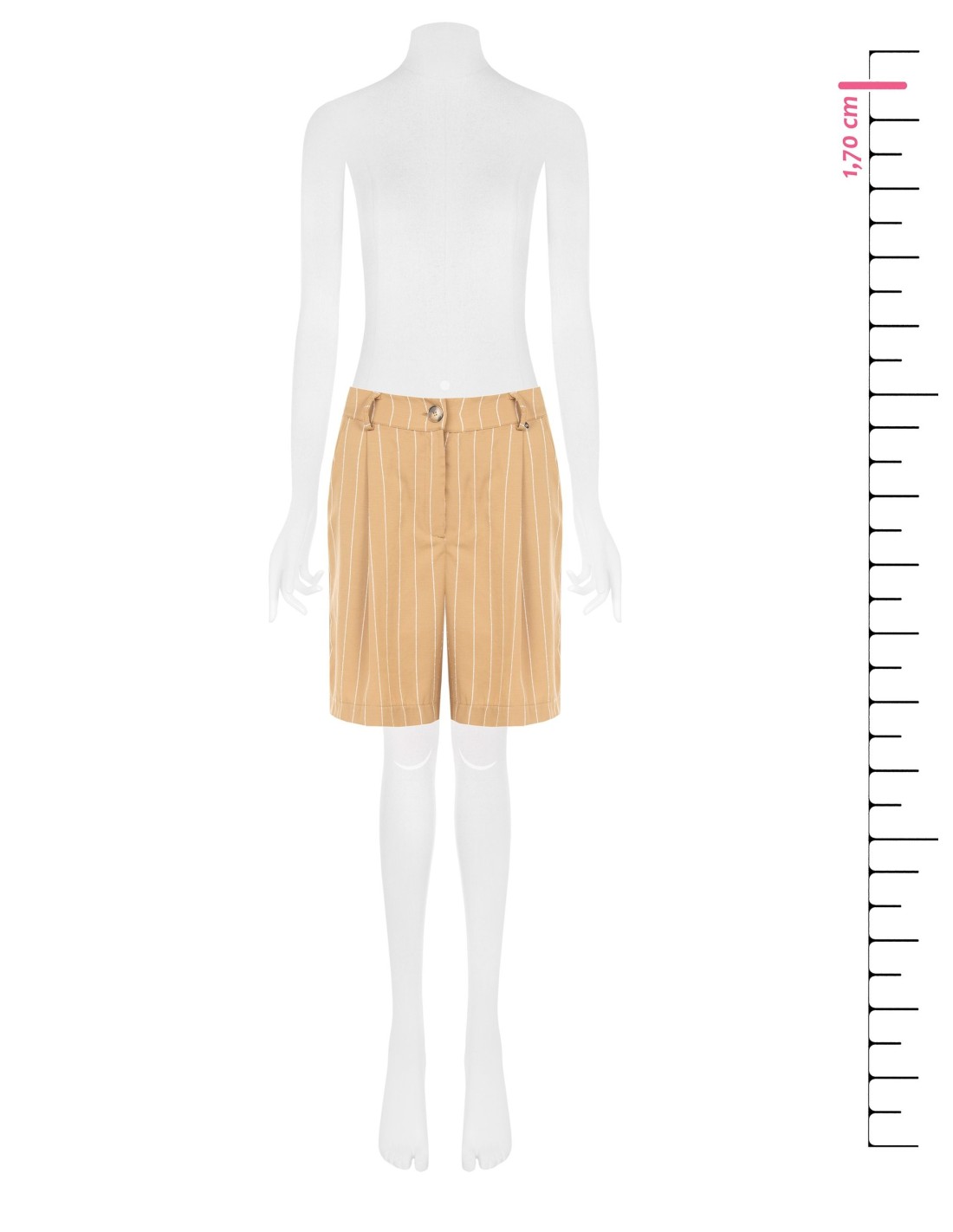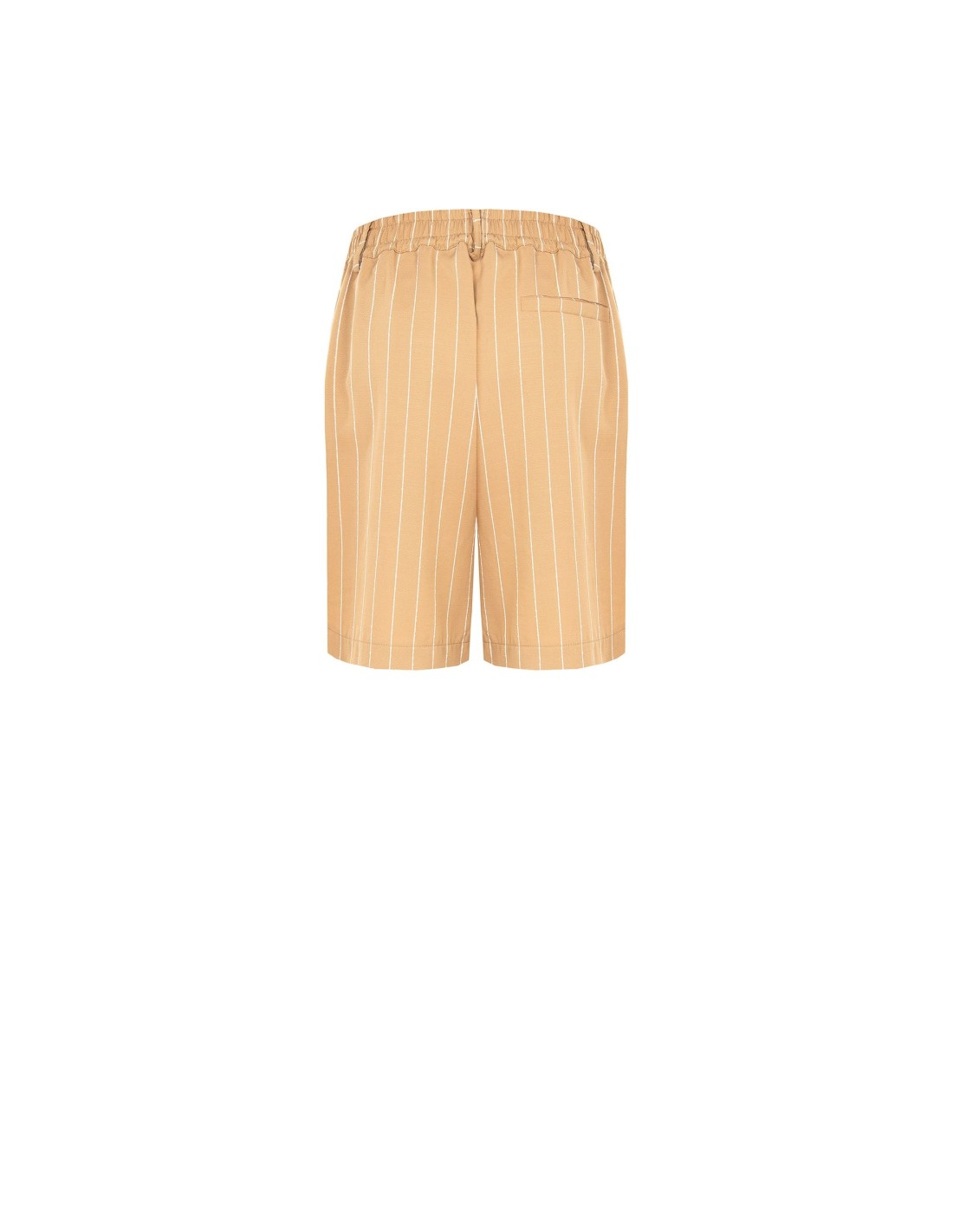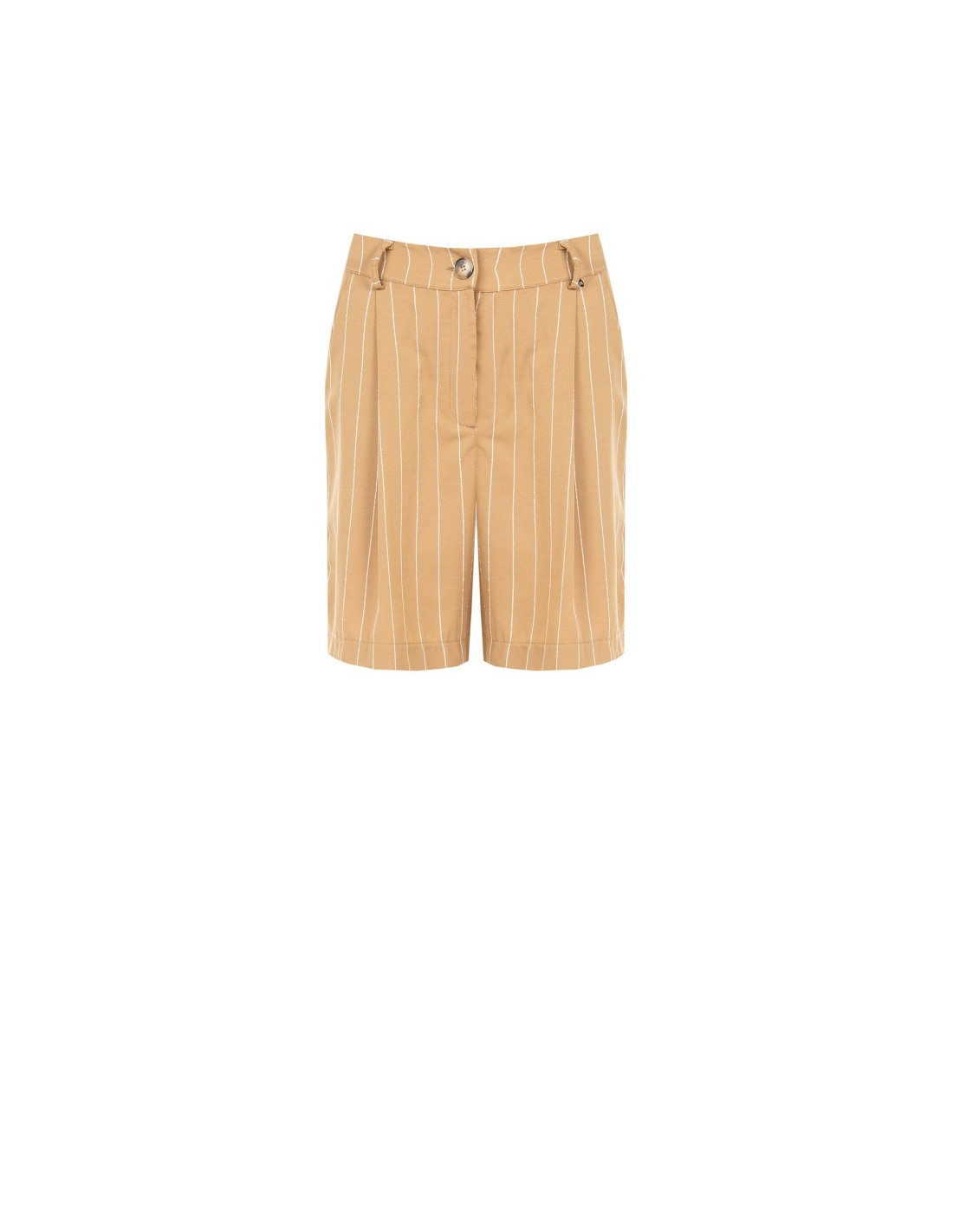 Bermuda com corte macio e fluido, em tecido leve de textura compacta com padrão de riscas verticais que alonga a silhueta. O fecho com botão e as pregas à frente acrescentam um toque de alfaiataria, perfeito para looks de escritório, escapadinhas urbanas ou chique do dia a dia.