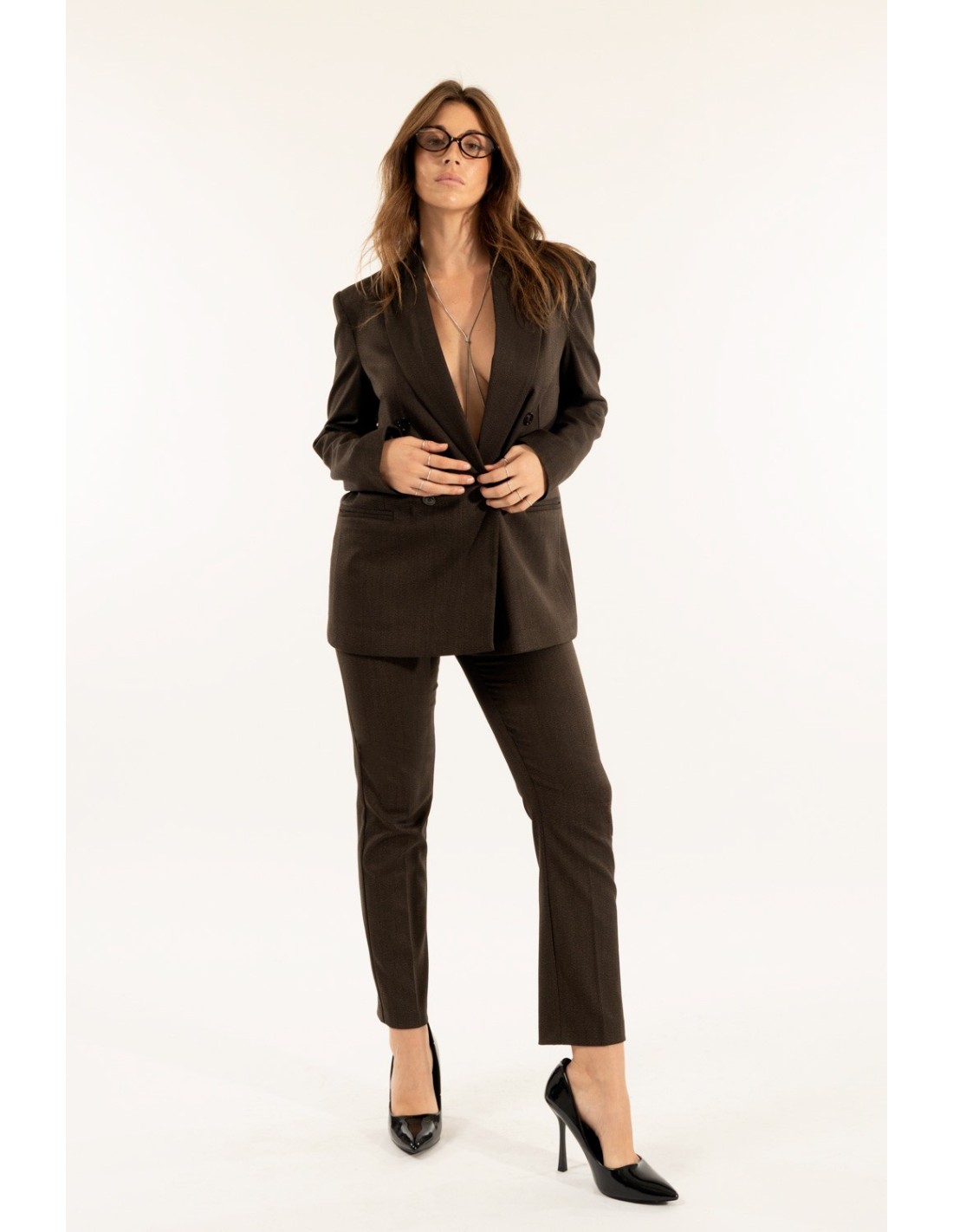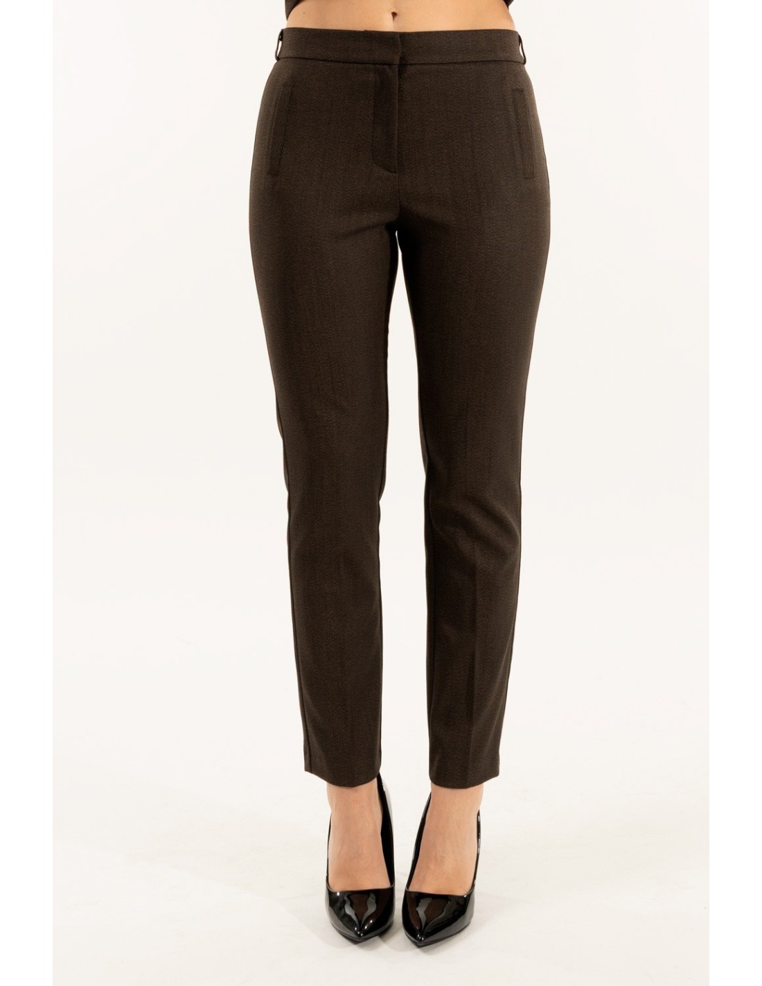 Kontatto assina uma calça de corte slim e cintura regular que alonga a silhueta sem renunciar ao conforto. Tecido fluido com toque macio e ligeira elasticidade. Passadores na cintura e bolsos embutidos definem o seu carácter sartorial. Perfeita para o escritório e para looks do dia a dia com sapatos de salto ou ténis.