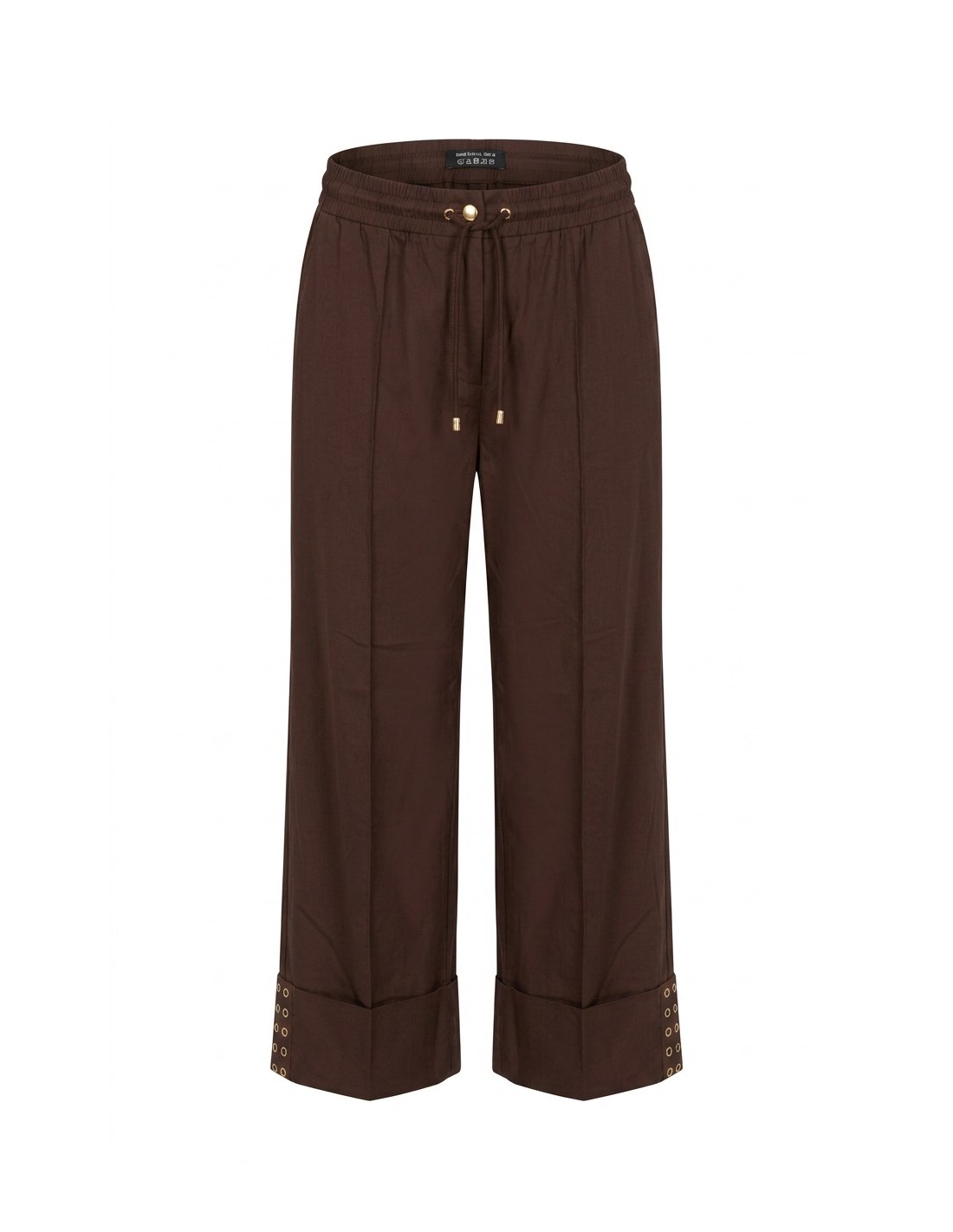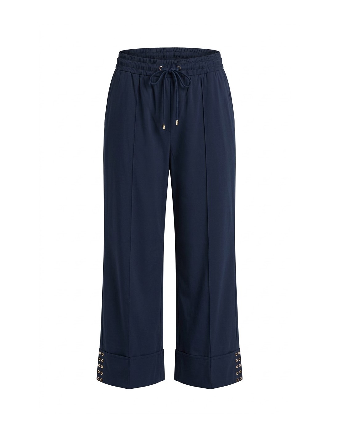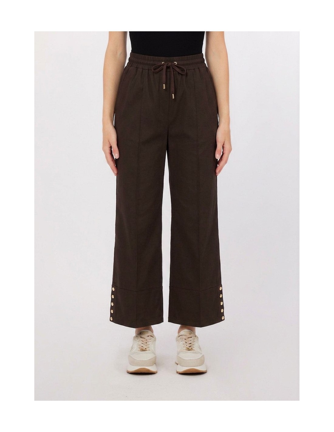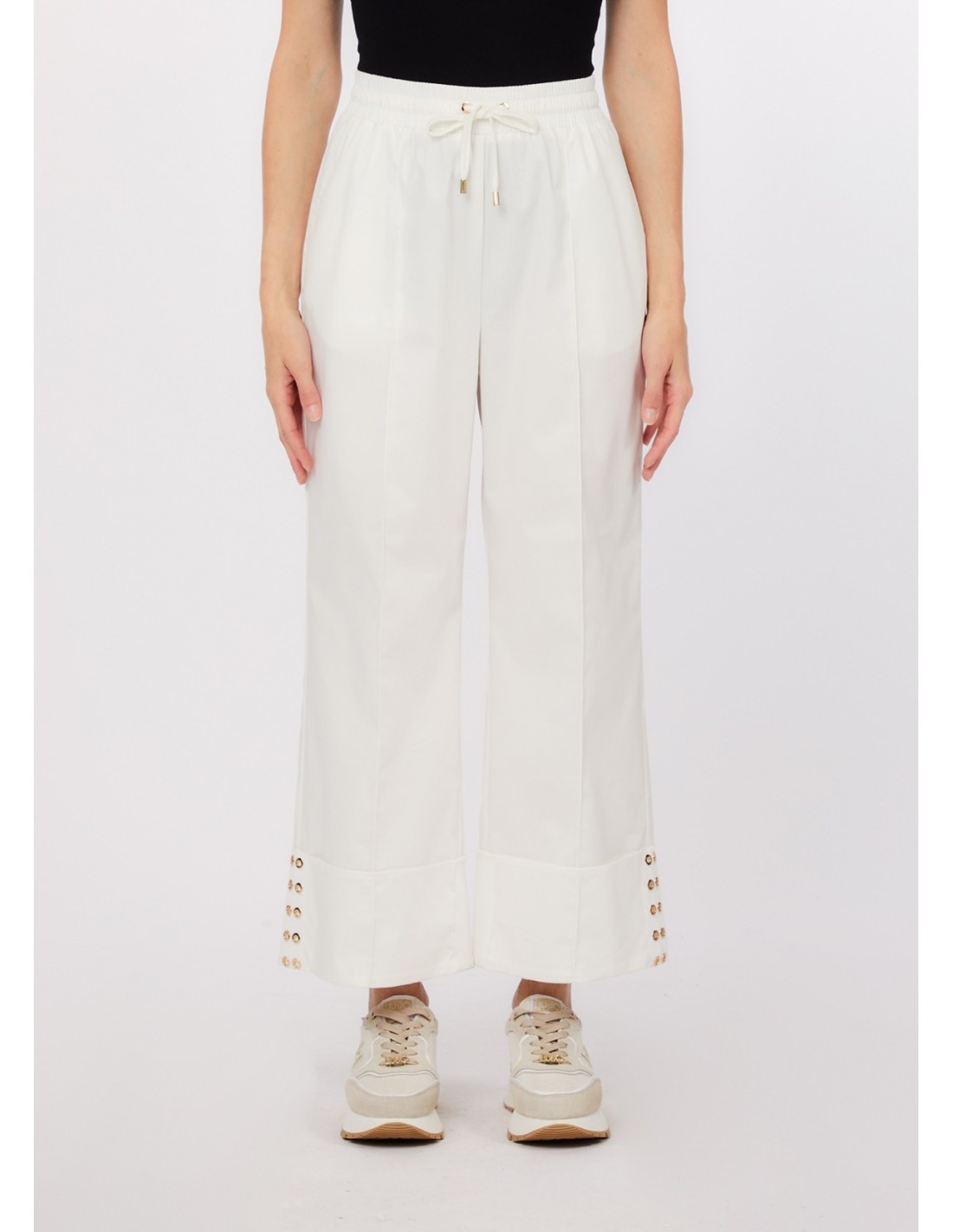 Calça lisa, elástico na cintura com cordão, vira maxi com tachas decorativas.