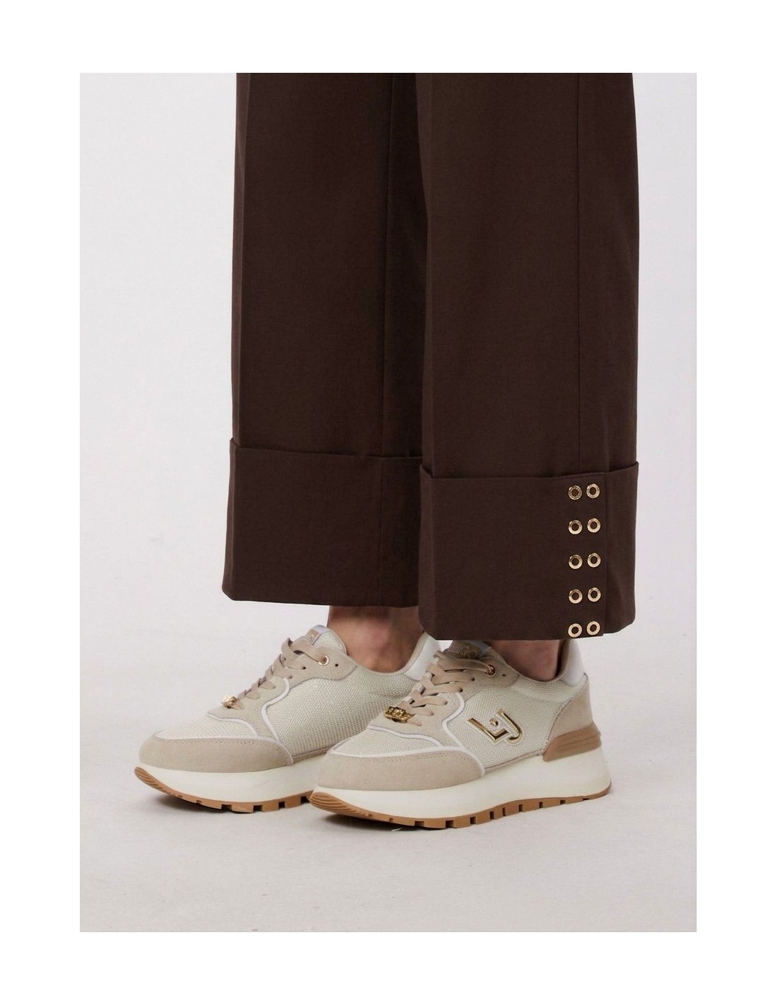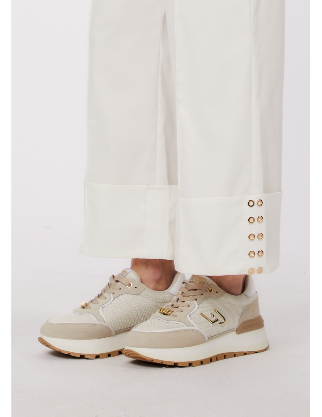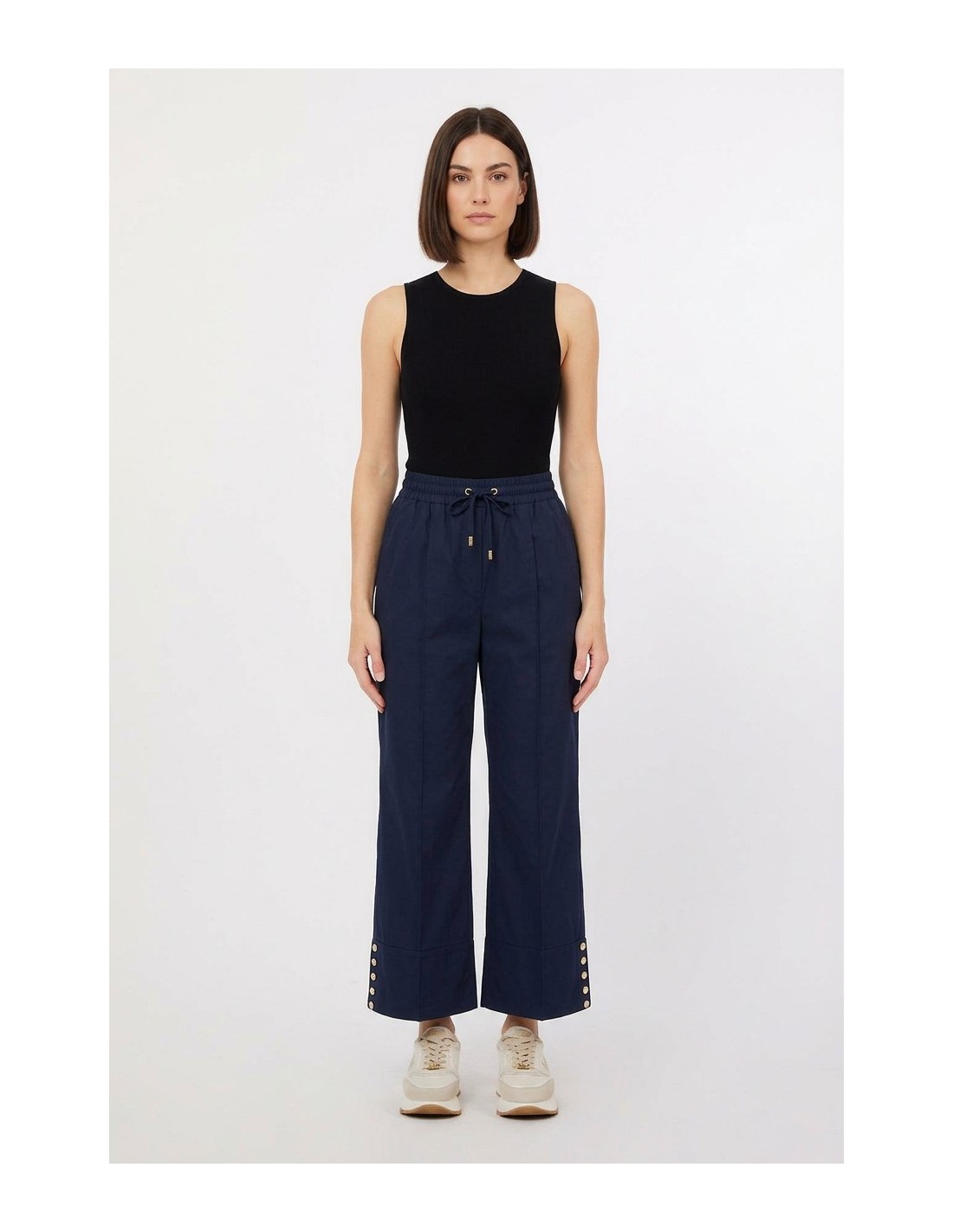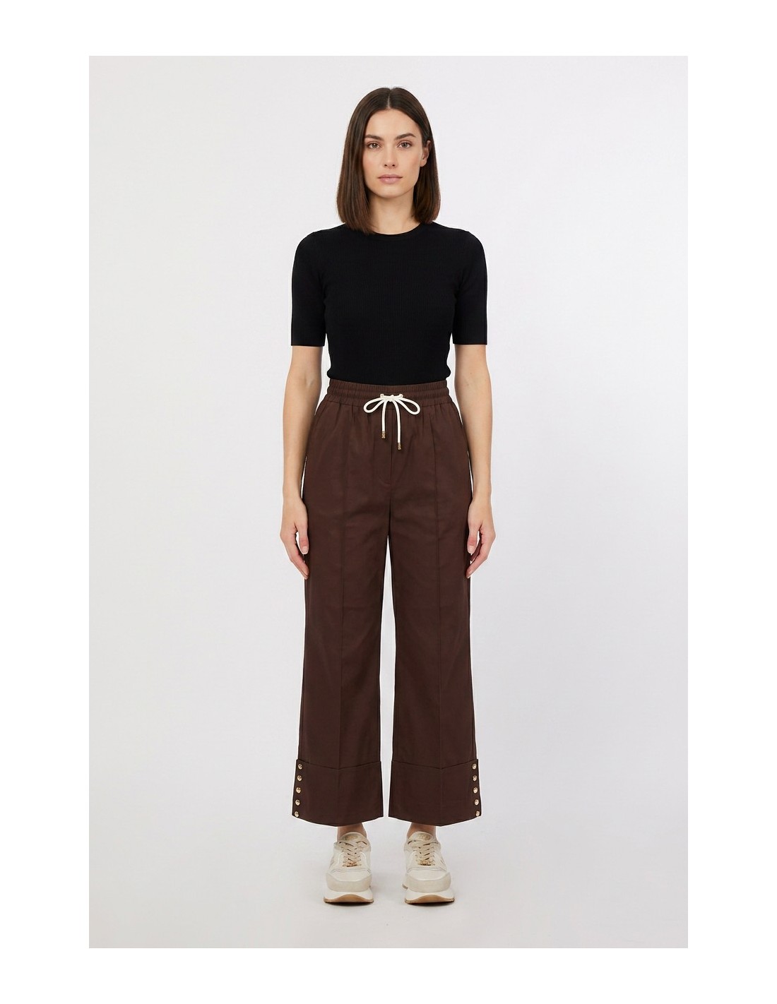 Calça lisa, elástico na cintura com cordão, vira maxi com tachas decorativas.