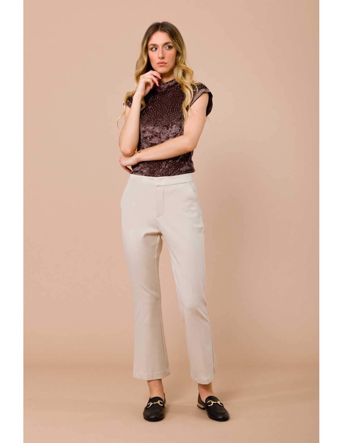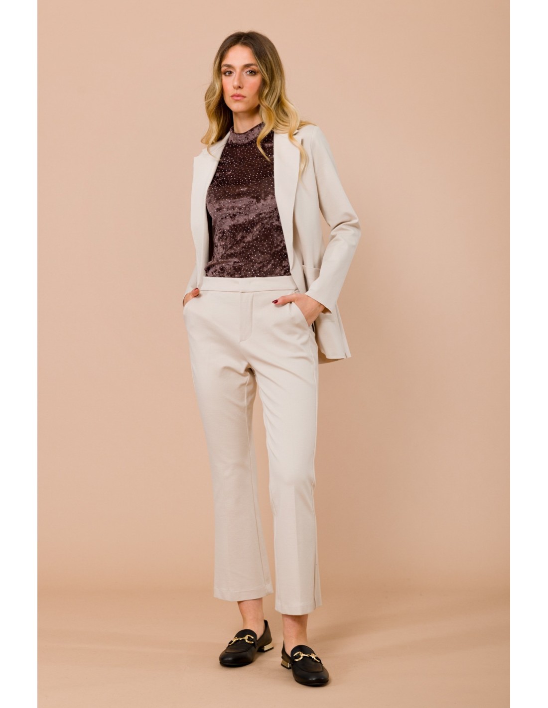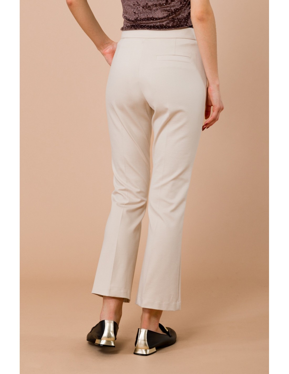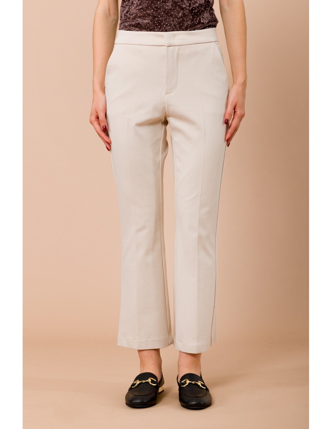 Maryley eleva o teu guarda-roupa com umas calças cropped de perna ligeiramente evasada, ajuste confortável que alonga a silhueta. Confeccionado em Punto Milano elástico e compacto, garante sustentação e liberdade de movimento. Bolsos à francesa e vinco frontal passado a ferro. Perfeito para o escritório e para o dia a dia.