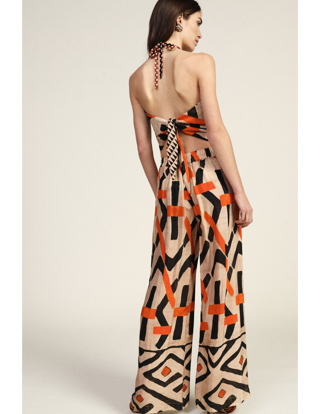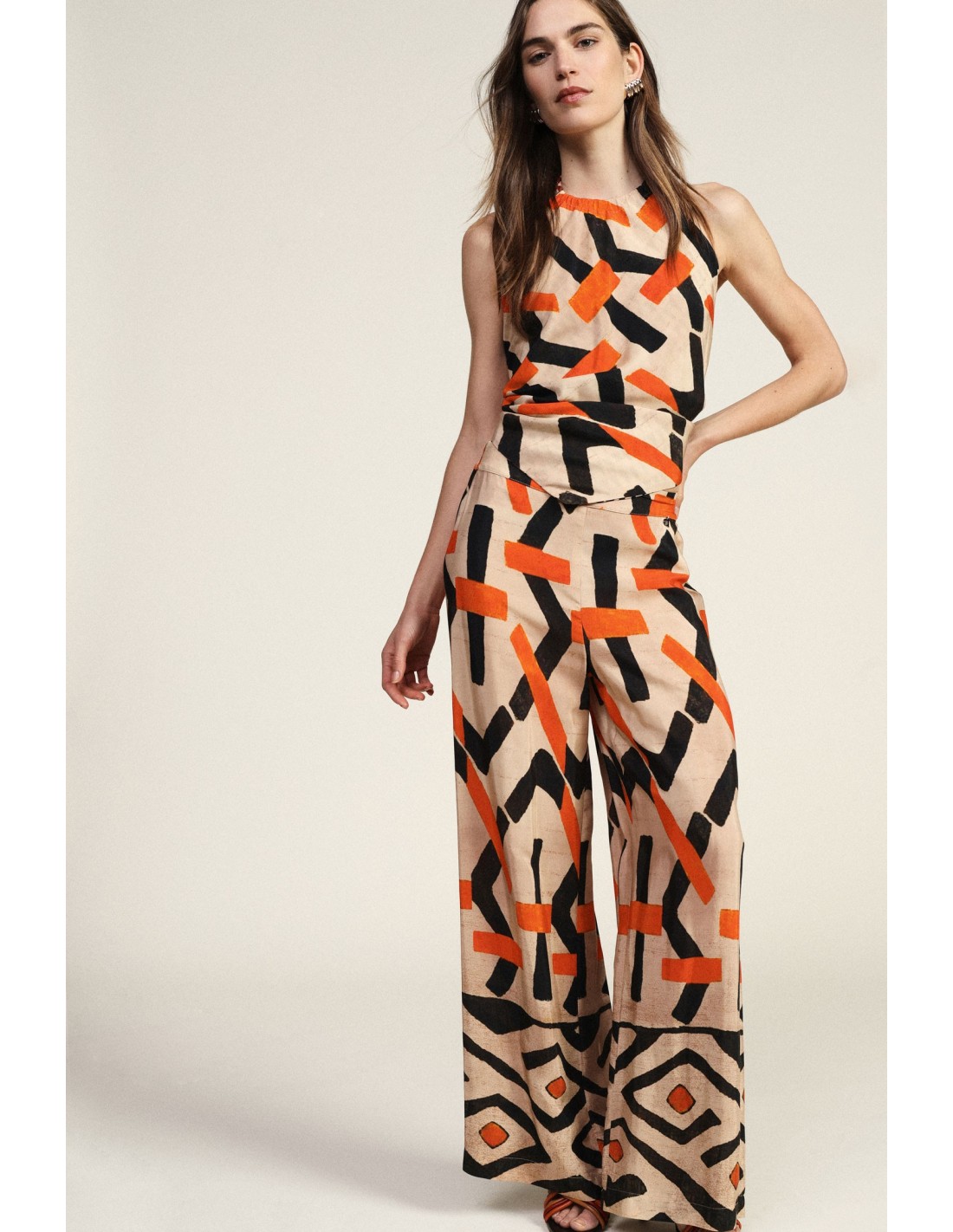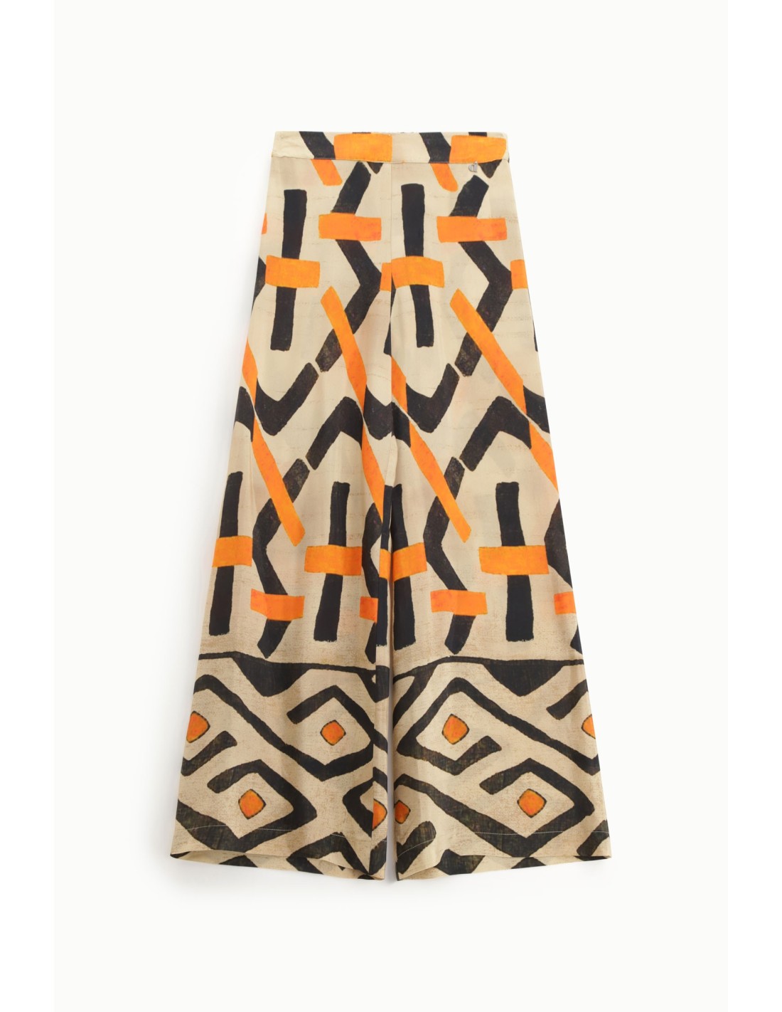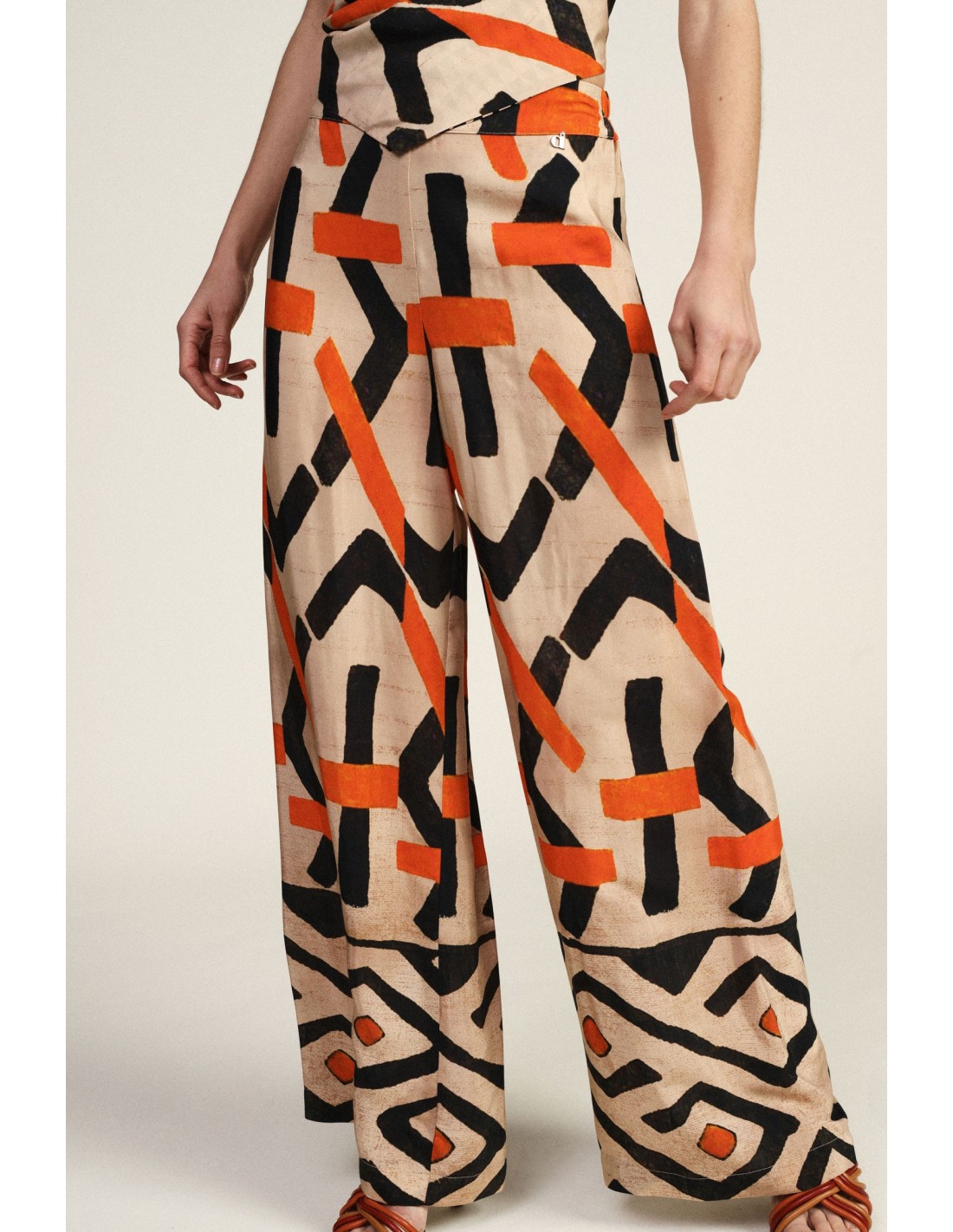 Deixe-se envolver pela sinuosidade destas calças largas, caracterizadas por um dinâmico padrão gráfico que percorre toda a sua extensão. Perfeitas para o dia-a-dia que não renuncia à originalidade, combinam facilmente com blusas e tops, tornando cada passo numa experiência de estilo. O corte confortável garante liberdade de movimentos.
