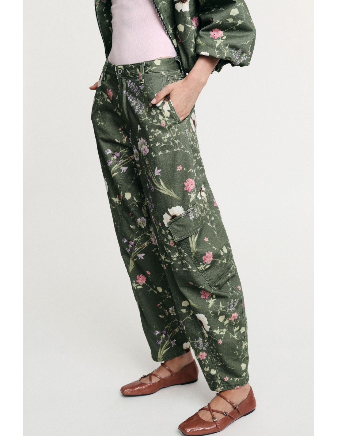 Calças cargo com estampa floral, cintura alta, bolsos laterais