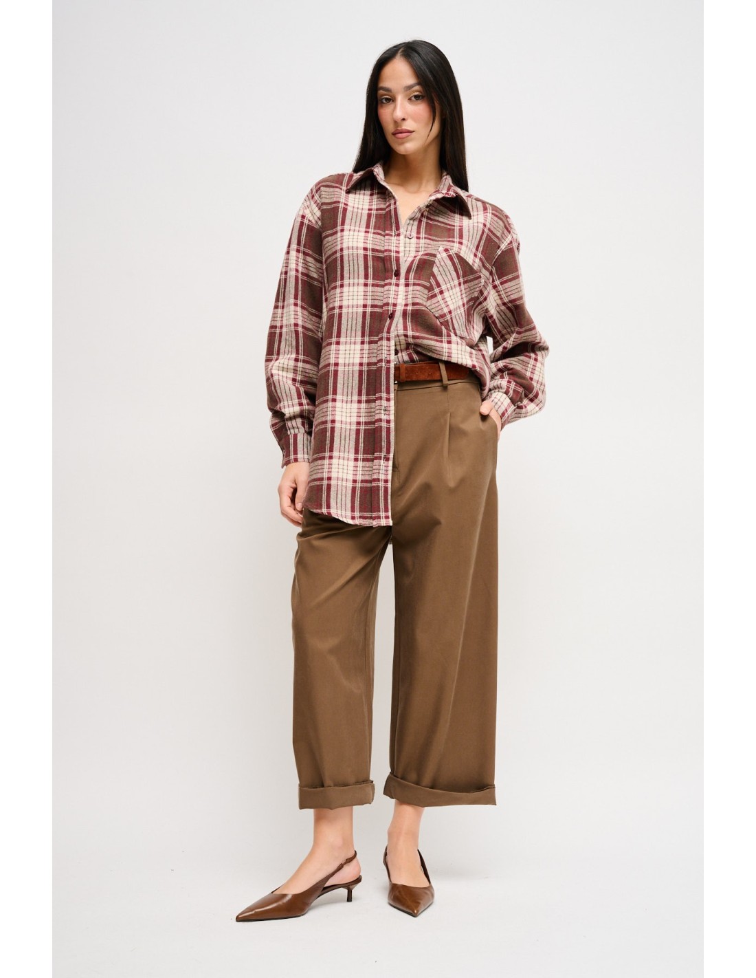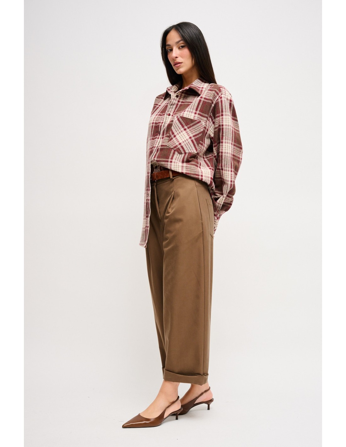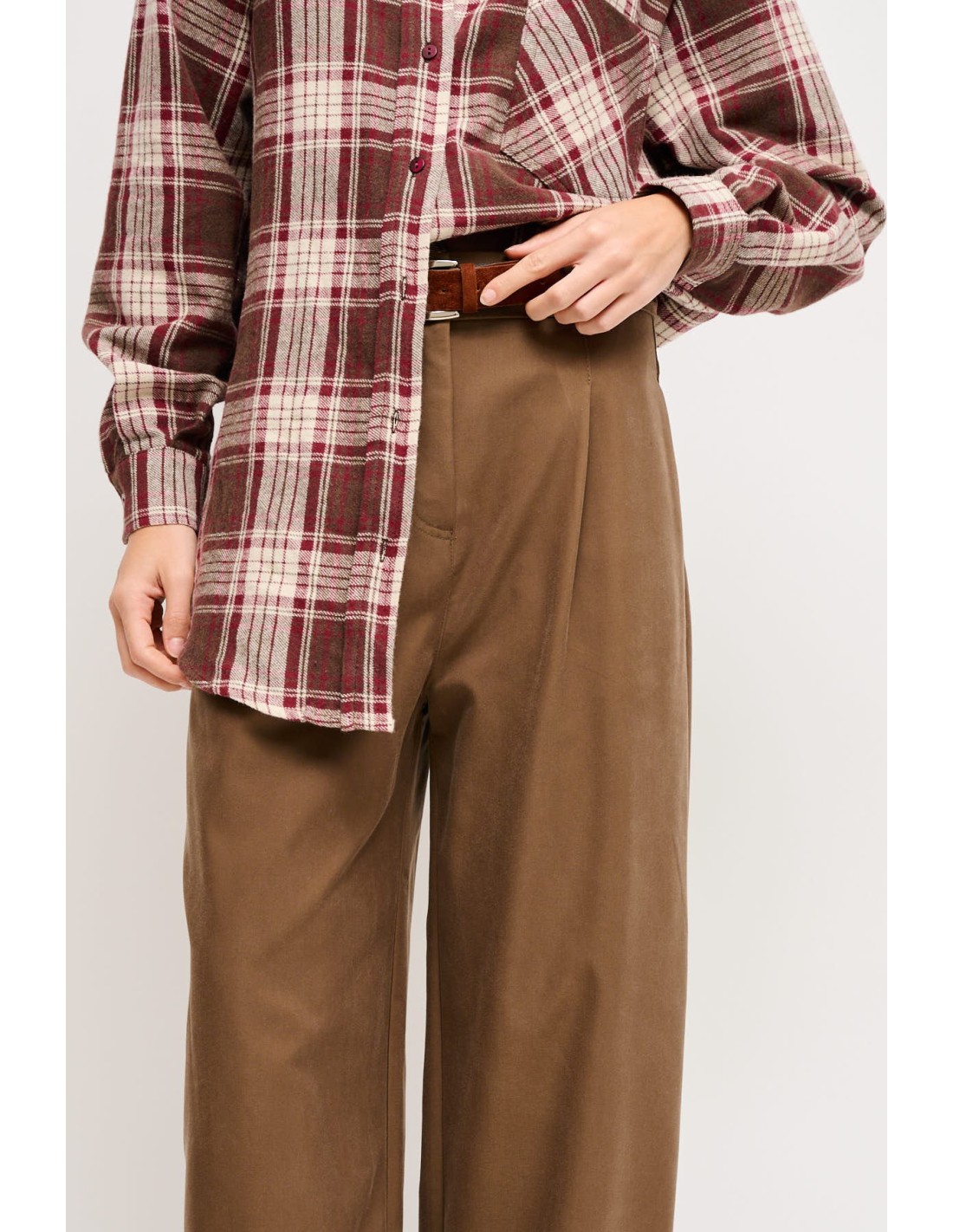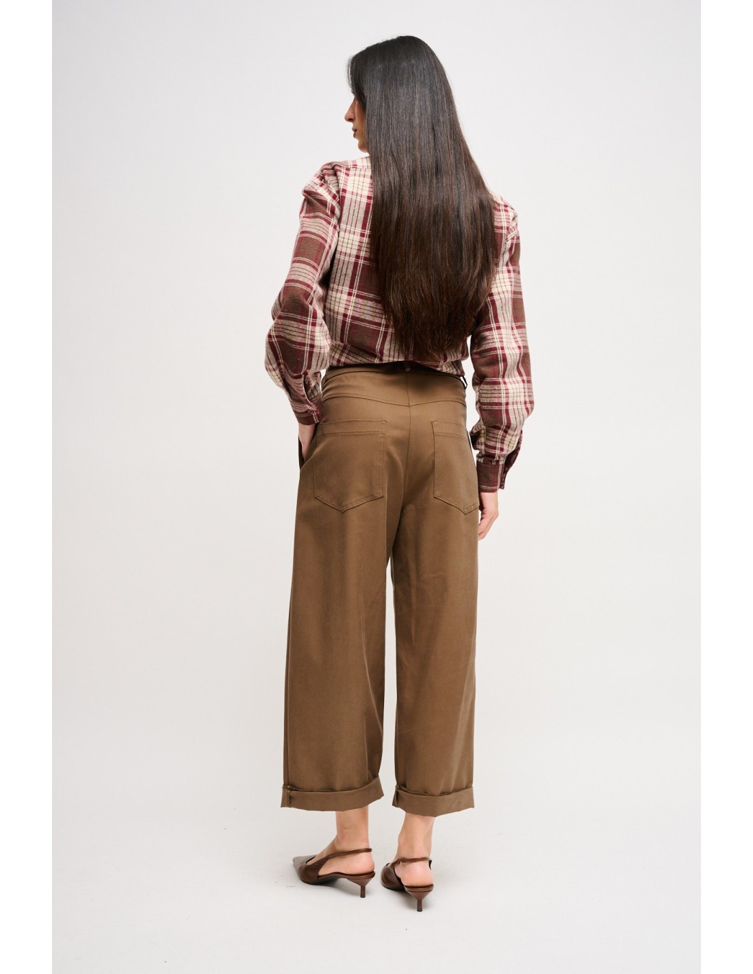 Maryley assina calças soltas e direitas, corte cropped com bainha virada para alongar o tornozelo. Tencel sedoso com efeito fluido para conforto durante todo o dia. Cintura com fivela oval e pregas frontais definem a cintura. Versátil do escritório ao fim de semana, perfeita com blazer ou camisola leve.