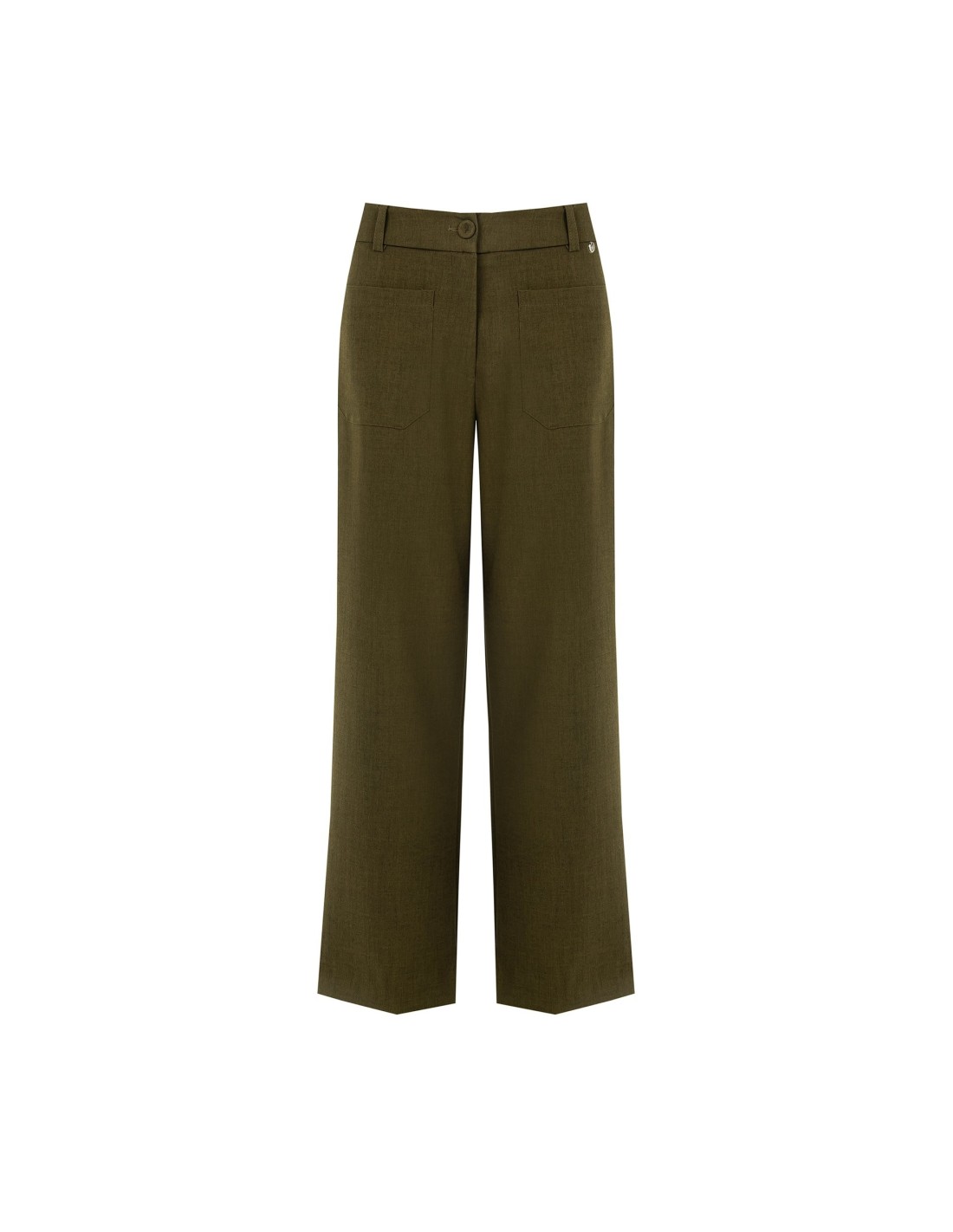 Corte reto até ao tornozelo em tecido leve com efeito linho: valoriza a silhueta sem apertar. Os bolsos frontais aplicados e o botão na cintura com um pequeno pendente metálico acrescentam carácter. Perfeitos do escritório ao aperitivo com uma simples troca de top.