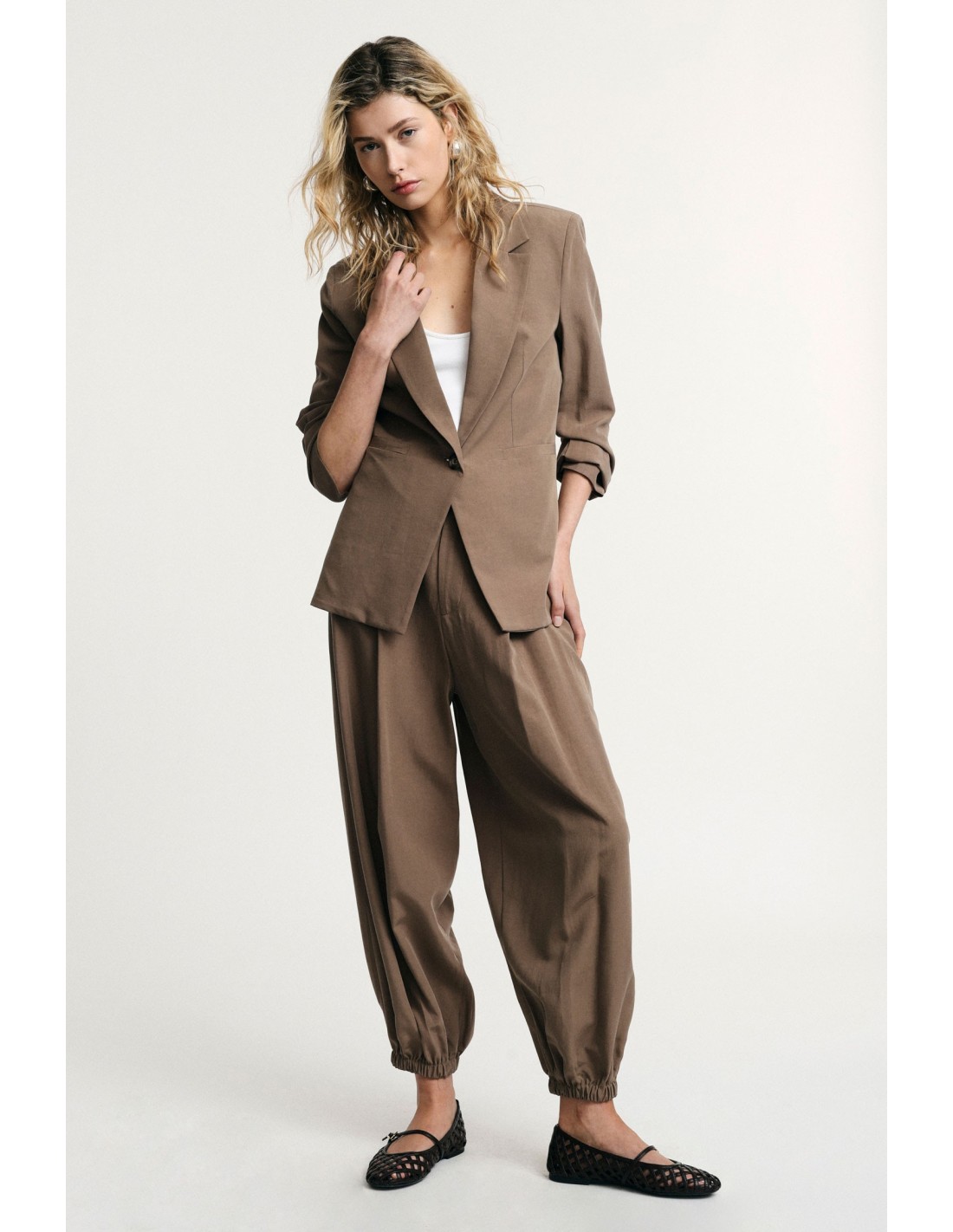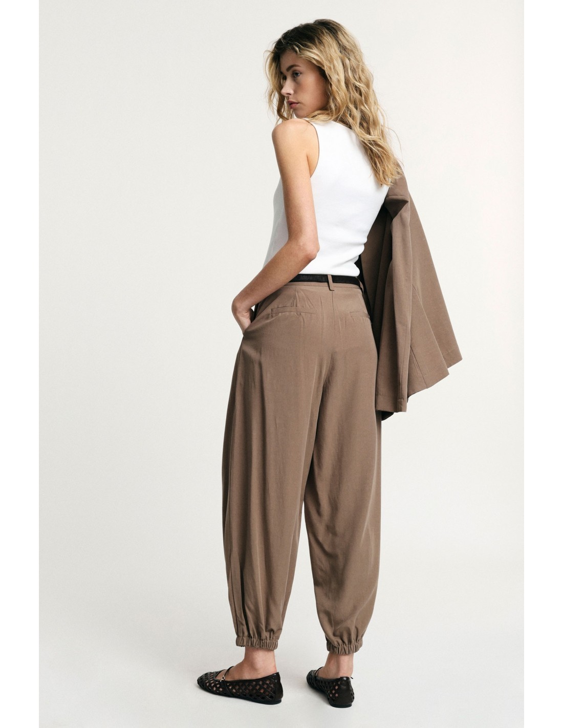 Vive a cidade com estas calças jogging de corte amplo e pinças frontais que oferecem conforto e liberdade de movimento. A barra elástica acrescenta carácter e praticidade, perfeitas para looks casuais do dia a dia mas também para outfits mais elaborados. Ideais para quem procura um estilo descontraído mas distintivo.