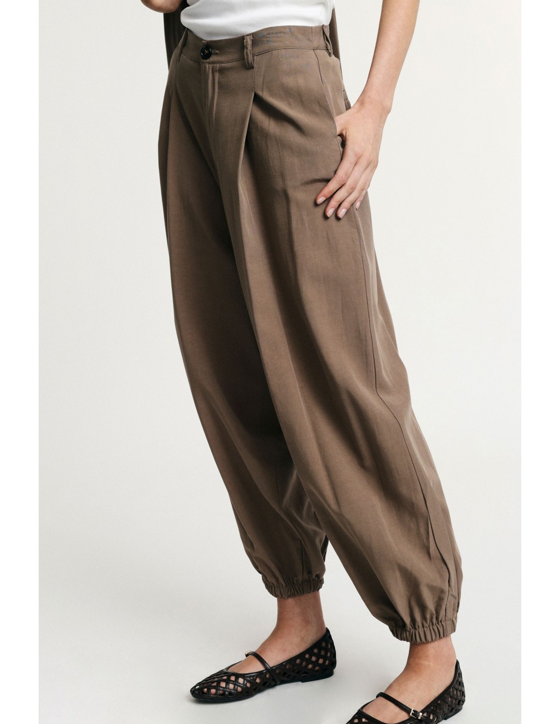 Calças jogging com pinças e elástico na barra