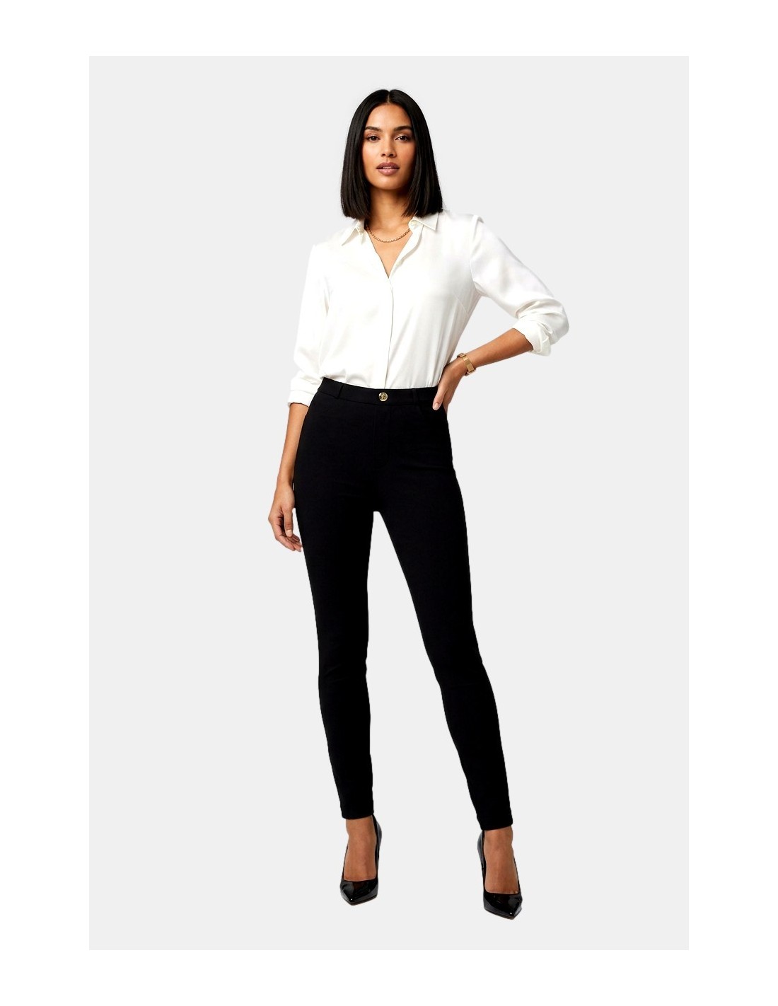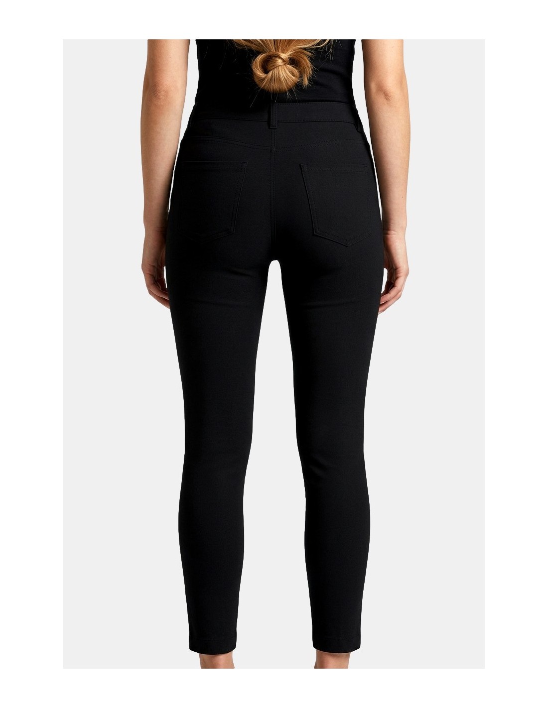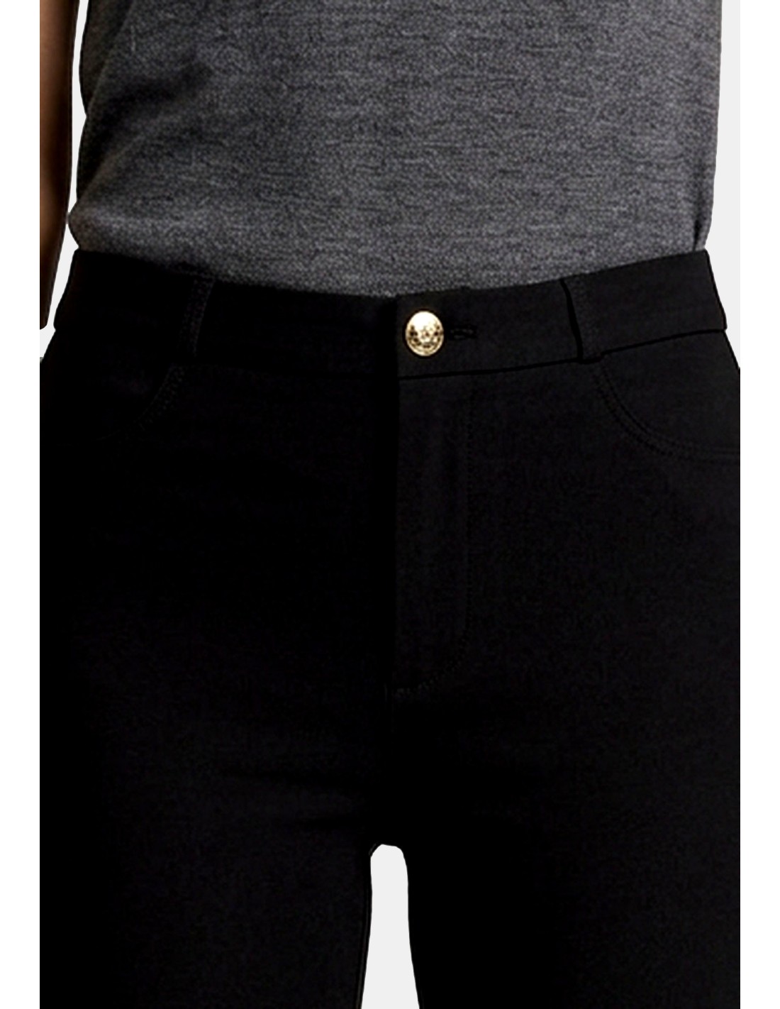 Calças modelo skinny, lisas, cintura regular.
