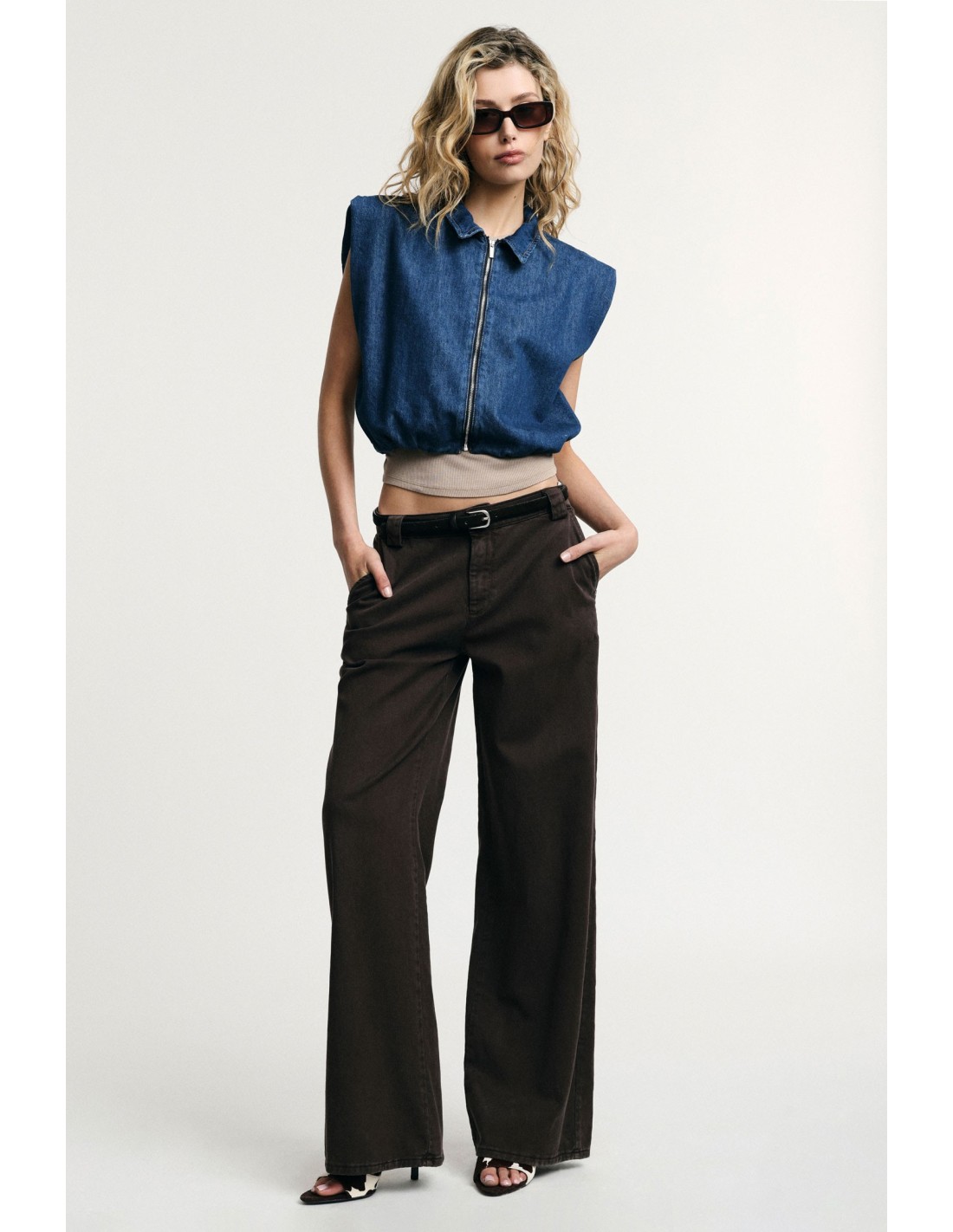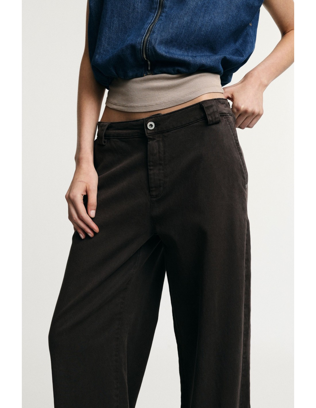 Estas calças palazzo de cintura baixa são a escolha perfeita para se destacar na cidade graças ao corte amplo e descontraído. Equipadas com passadores para cinto, fecho com botão e fecho éclair e bolsos laterais funcionais, convidam a experimentar novas combinações e a expressar a sua criatividade todos os dias.