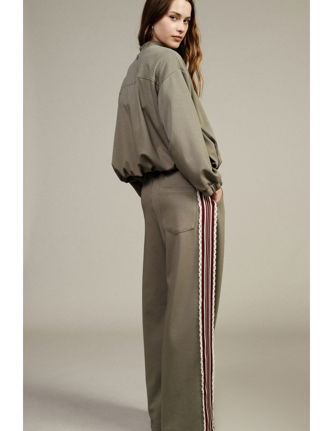 Com estas calças palazzo, pode dar um toque original ao seu look do dia a dia sem renunciar ao conforto. A silhueta ampla garante liberdade de movimento, enquanto o cós elástico e o cordão na cintura proporcionam praticidade. A faixa lateral às riscas e o detalhe de passamanaria acrescentam personalidade e atenção aos pormenores.