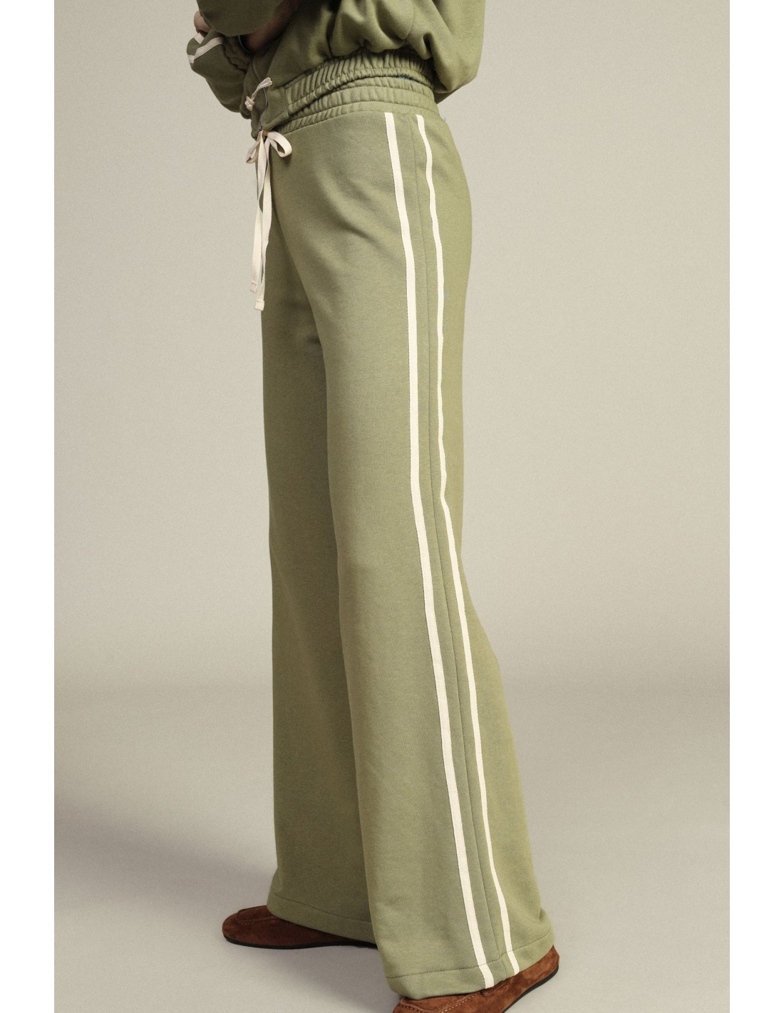 Calças palazzo com cordão e faixas laterais