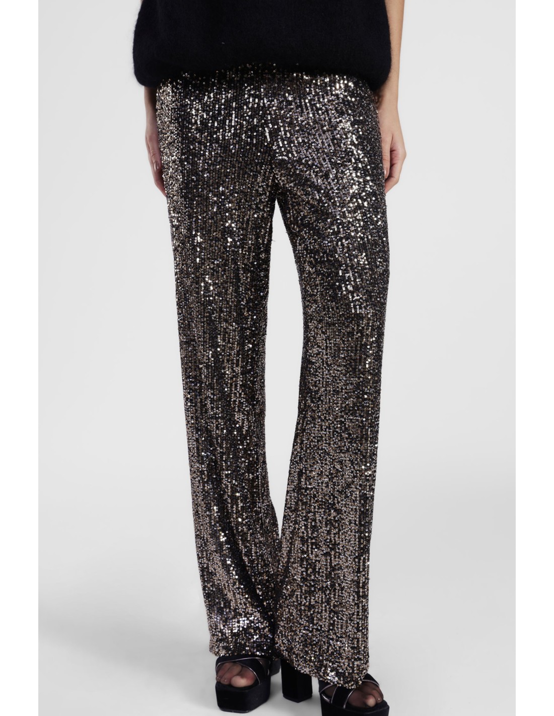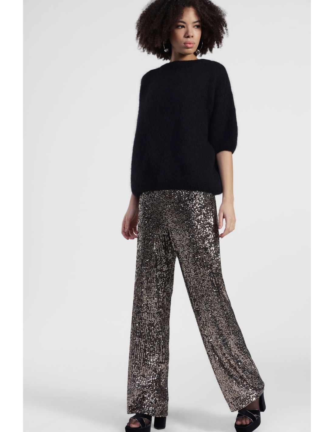 Deixa-te surpreender pelo corte amplo destas calças palazzo decoradas com lantejoulas por toda a superfície. O design confortável e a linha fluida conferem movimento e um toque brilhante, perfeito para criar looks originais de dia e de noite. Imagina usá-las para te sentires verdadeiramente única a cada passo.