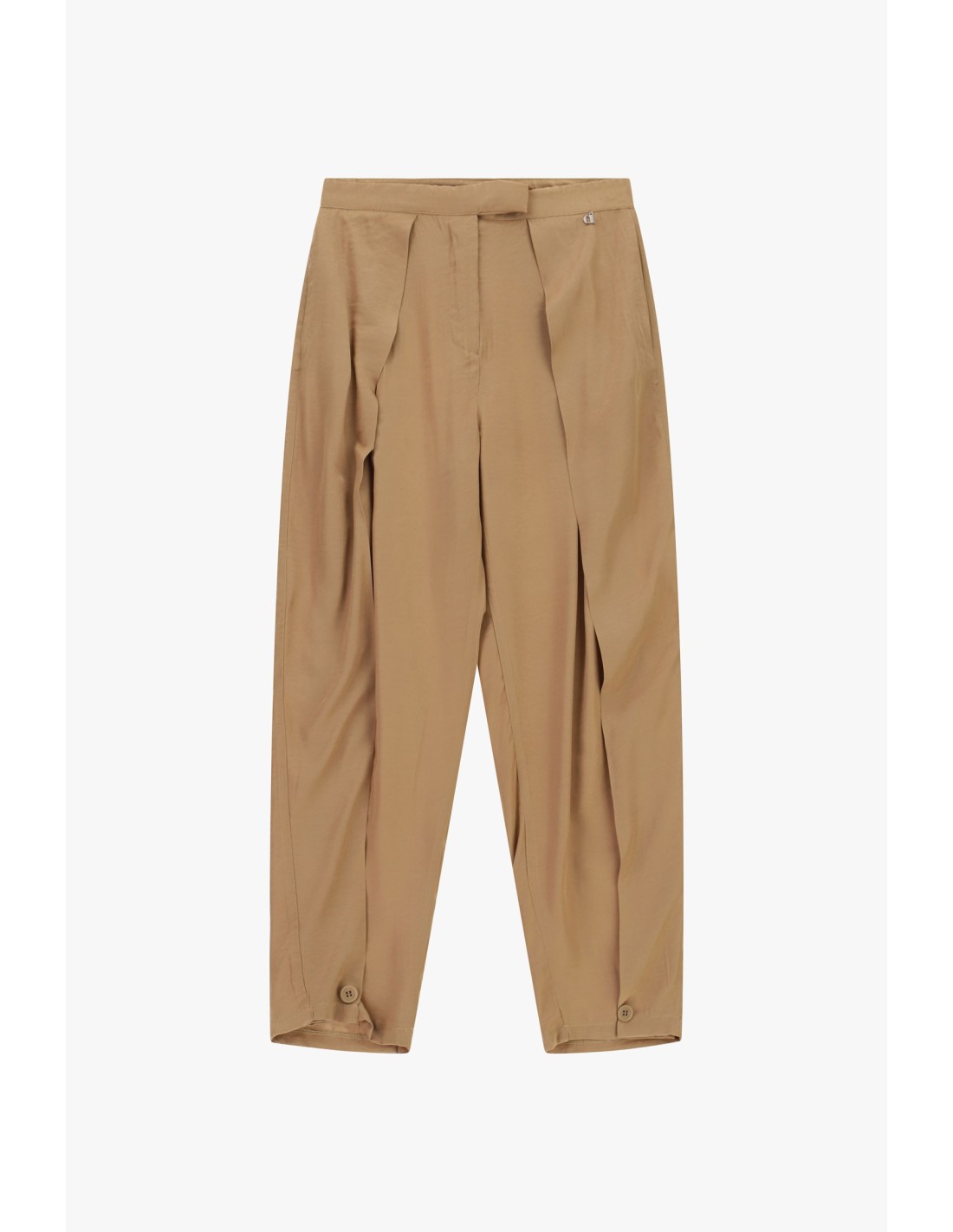 Linhas fluidas que te acompanham em todos os momentos do dia: calças palazzo com pinças frontais que conferem movimento e uma silhueta elegante mas descontraída. A bainha com fecho de botões acrescenta um toque original e prático, perfeito para quem procura um estilo pessoal e sempre funcional.