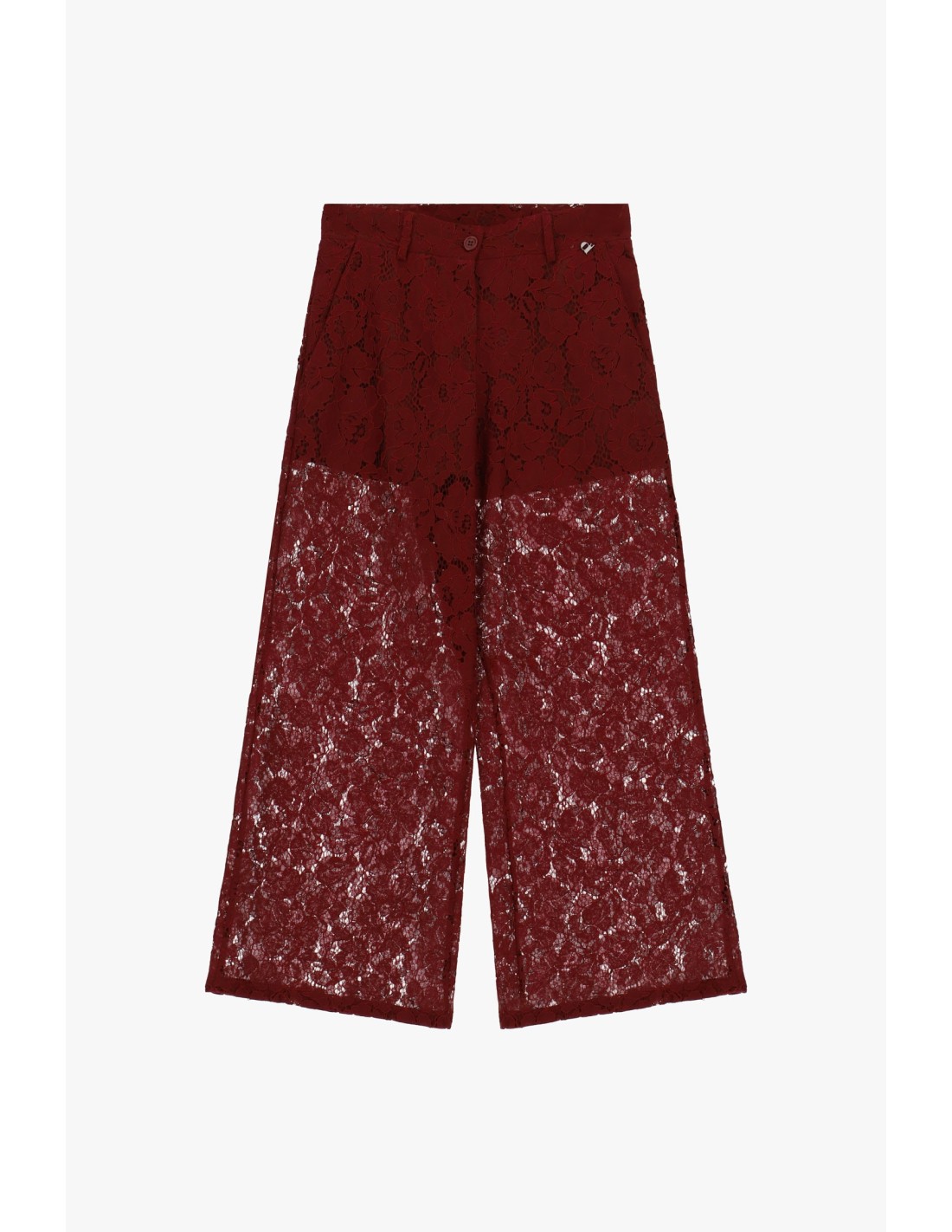 Estas calças palazzo são enriquecidas com um bordado em renda com motivo floral e uma silhueta ampla e fluida que proporciona liberdade de movimento no dia a dia. O detalhe transparente na parte inferior cria um efeito de leveza, perfeito para acrescentar personalidade a qualquer look, seja para um passeio ou para uma ocasião especial.