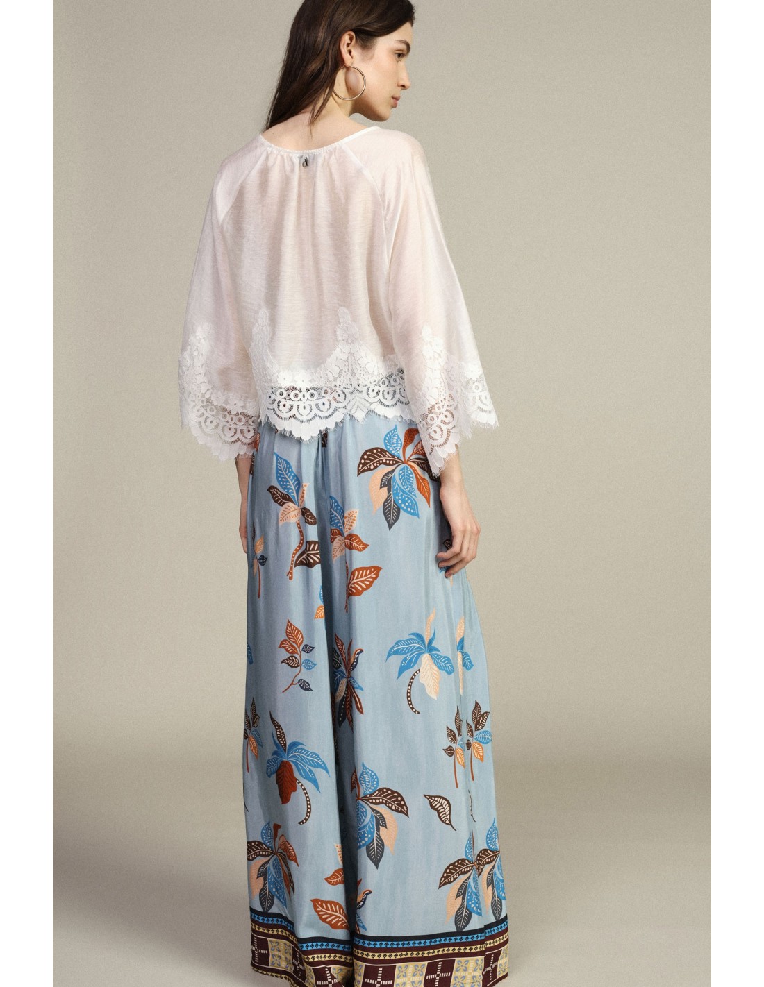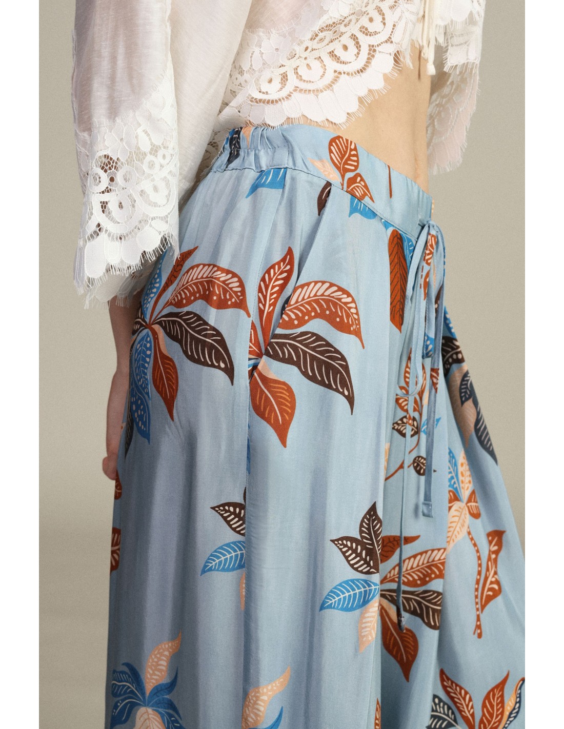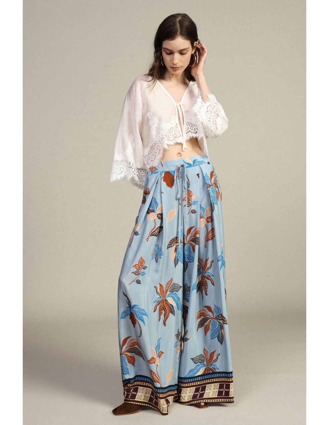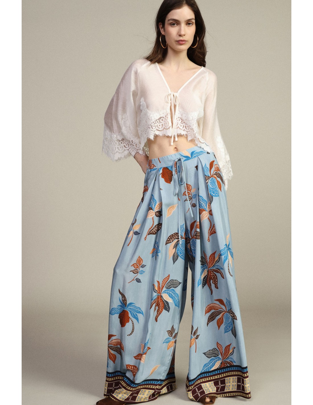 Estas calças palazzo conquistam pela sua silhueta ampla e pela estampa floral vibrante. A cintura alta com cordão envolve-te com praticidade e oferece conforto ao longo de todo o dia. Imagina usá-las enquanto passeias leve: a amplitude e os detalhes originais tornam cada look único e feminino.