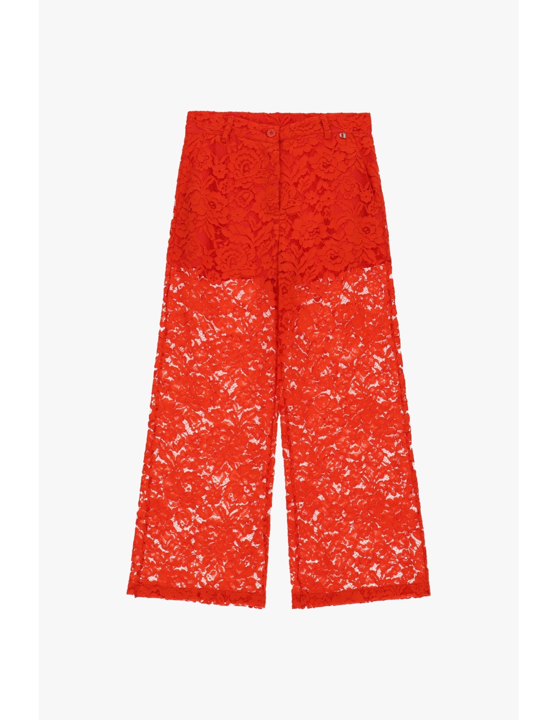 Estas calças palazzo de perna larga impressionam pelo seu trabalho em renda com padrão floral, perfeitas para quem gosta de se destacar nos pormenores. A silhueta ampla confere movimento e leveza, ideal para usar tanto em ocasiões especiais como para dar um toque original ao quotidiano.