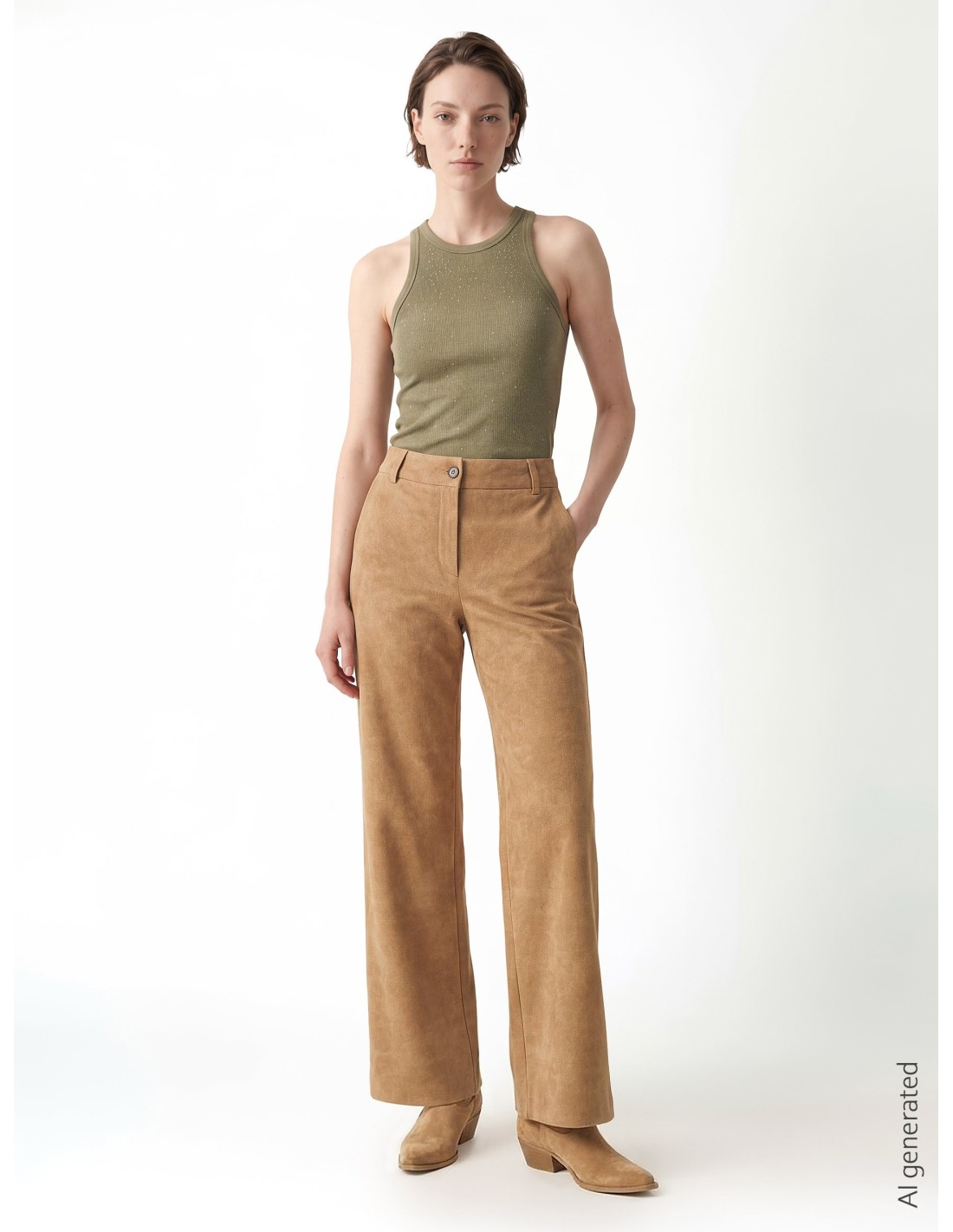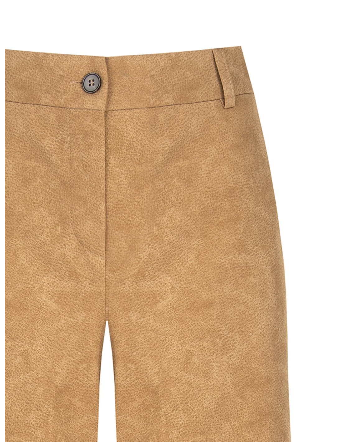 Calças de perna larga em suave pele sintética camurçada, com ligeiras tonalidades que conferem profundidade à textura. A cintura com elástico na parte de trás e fecho frontal com botão realça a silhueta e garante conforto, perfeitas do escritório ao pós-trabalho.