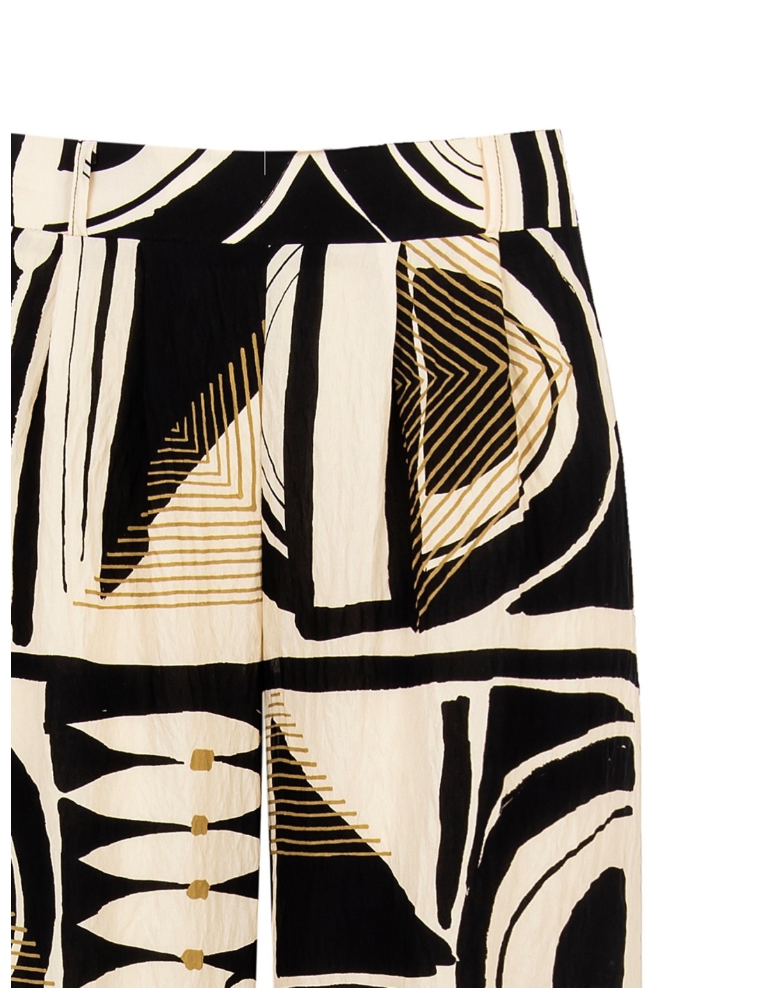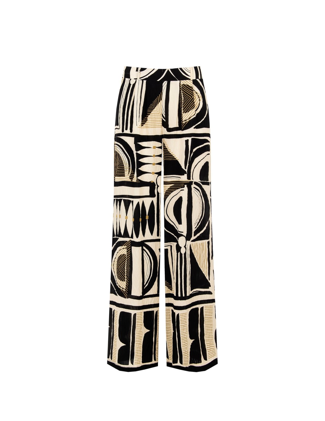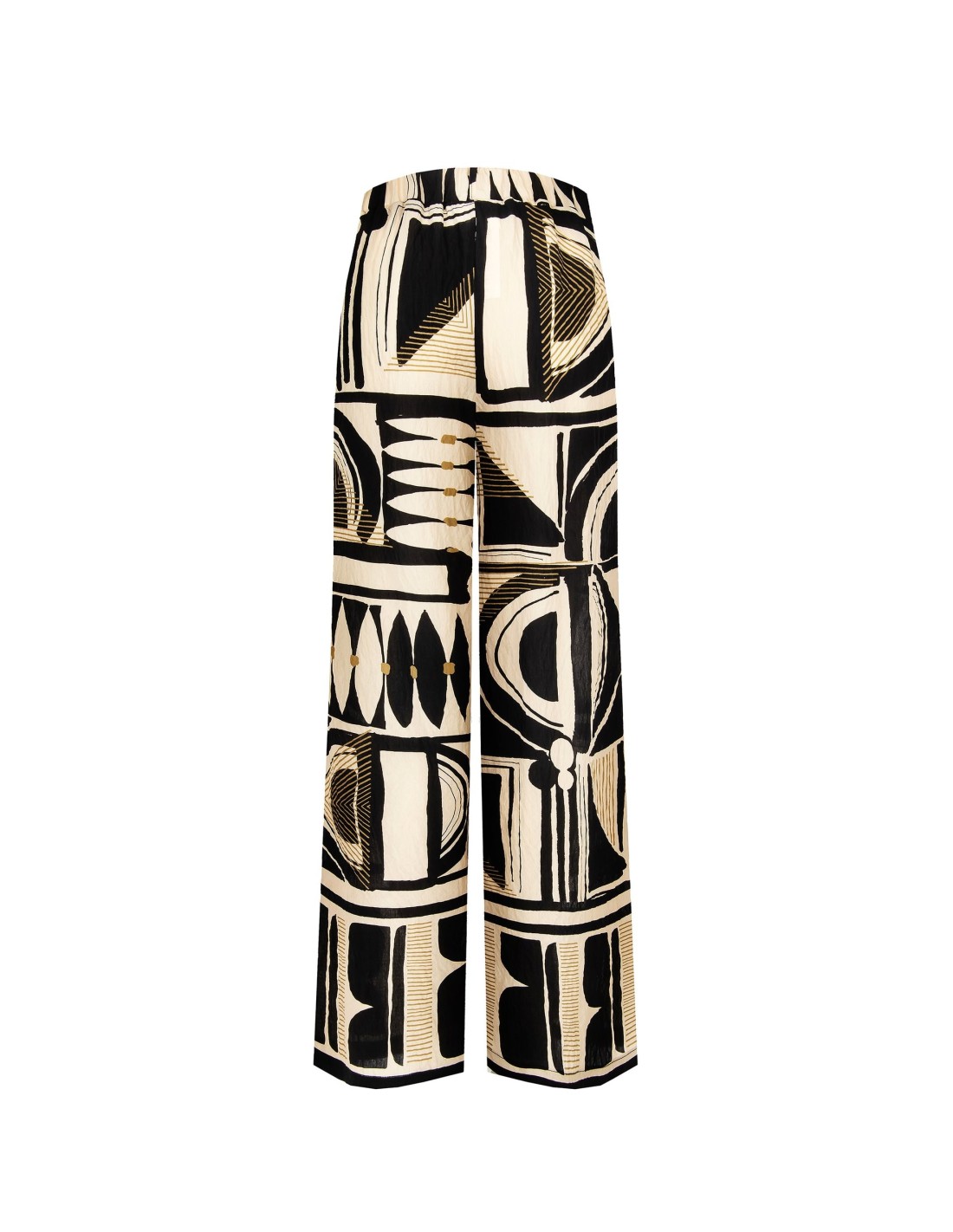 Corte amplo e fluido para um caimento que afina com naturalidade. Em viscose leve com uma textura delicadamente amarrotada, envolve com conforto e movimento. A cintura com elástico na parte de trás e a estampa gráfica tornam-no versátil e requintado, perfeito do escritório ao aperitivo.