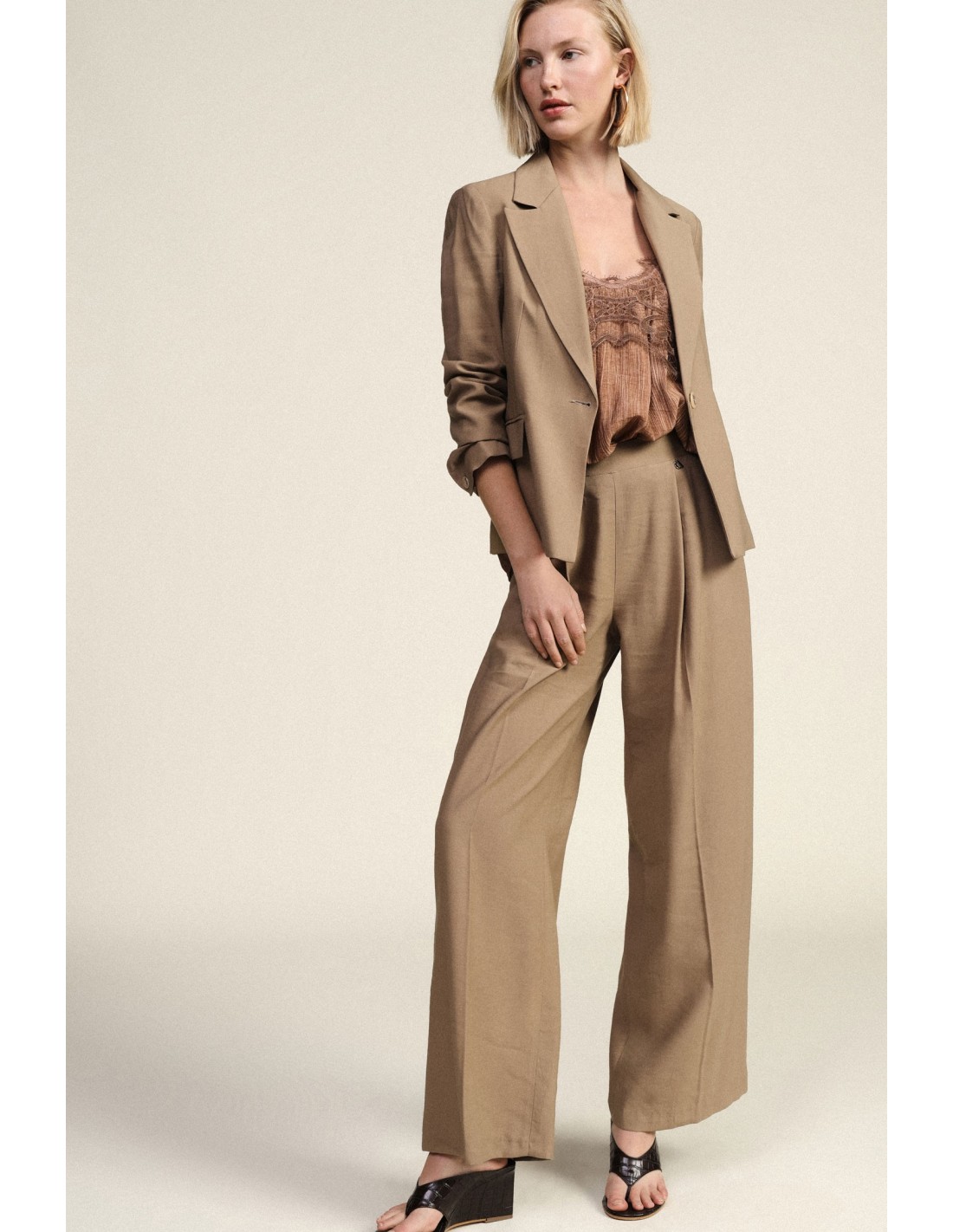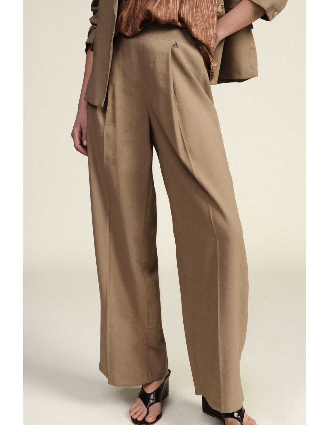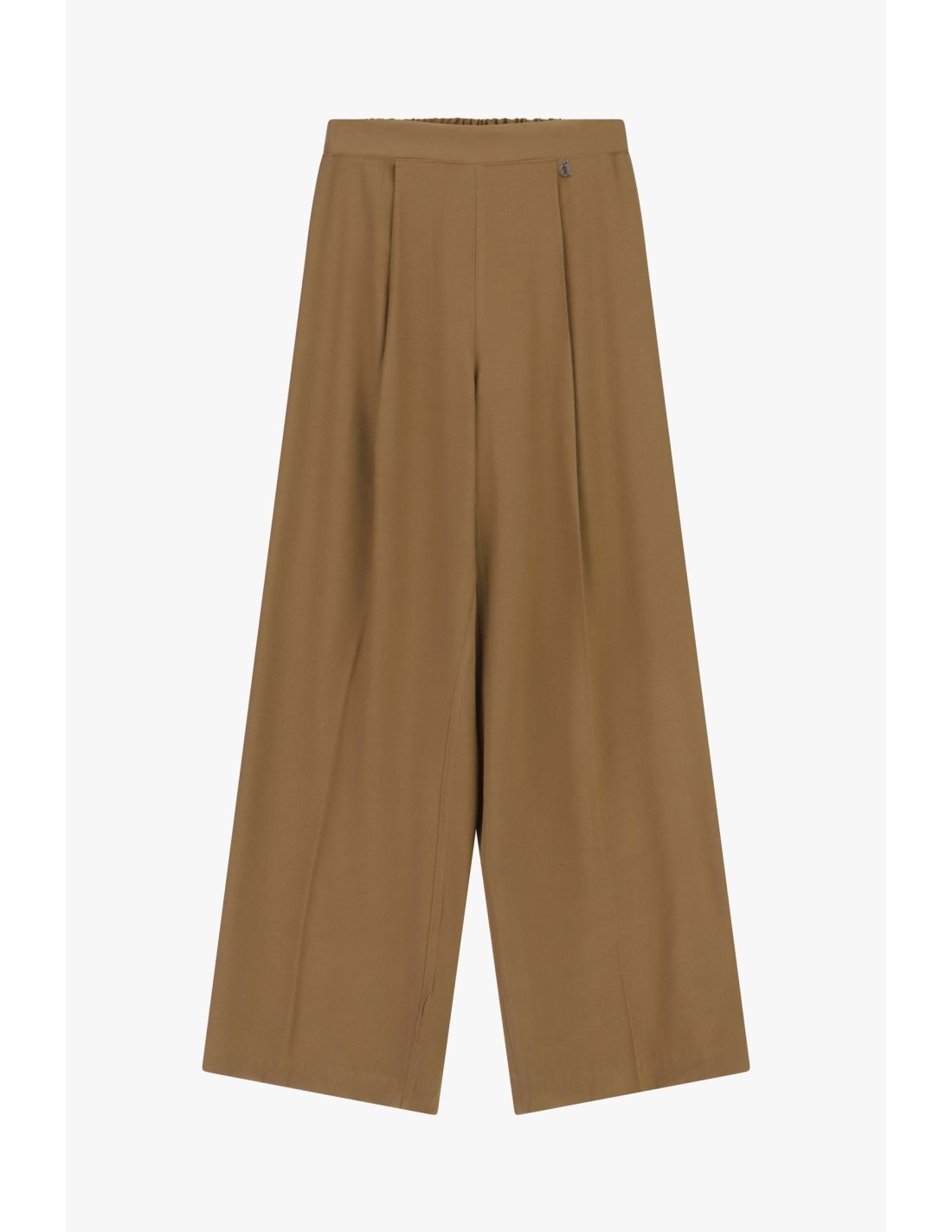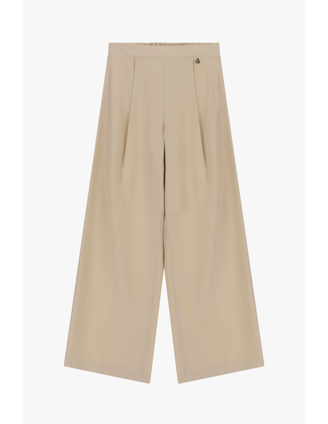 Calças palazzo de cintura alta, enriquecidas com suaves pinças frontais que conferem um efeito fluido e de movimento a cada passo. A linha ampla acompanha com leveza tanto looks do dia a dia como momentos especiais. Elástico na parte de trás para um ajuste fácil e confortável, perfeitas para se sentir livre e original em qualquer ocasião.