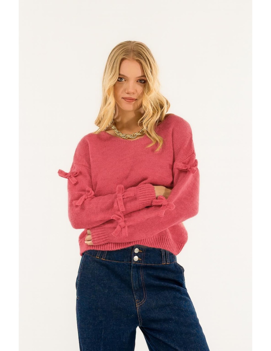 Uma peça que conquista à primeira vista: pormenores românticos de laço nas mangas, suavidade envolvente e estilo intemporal. Perfeito para quem gosta de ser sofisticada e feminina em todas as ocasiões. Um toque chique irresistível para o seu guarda-roupa.