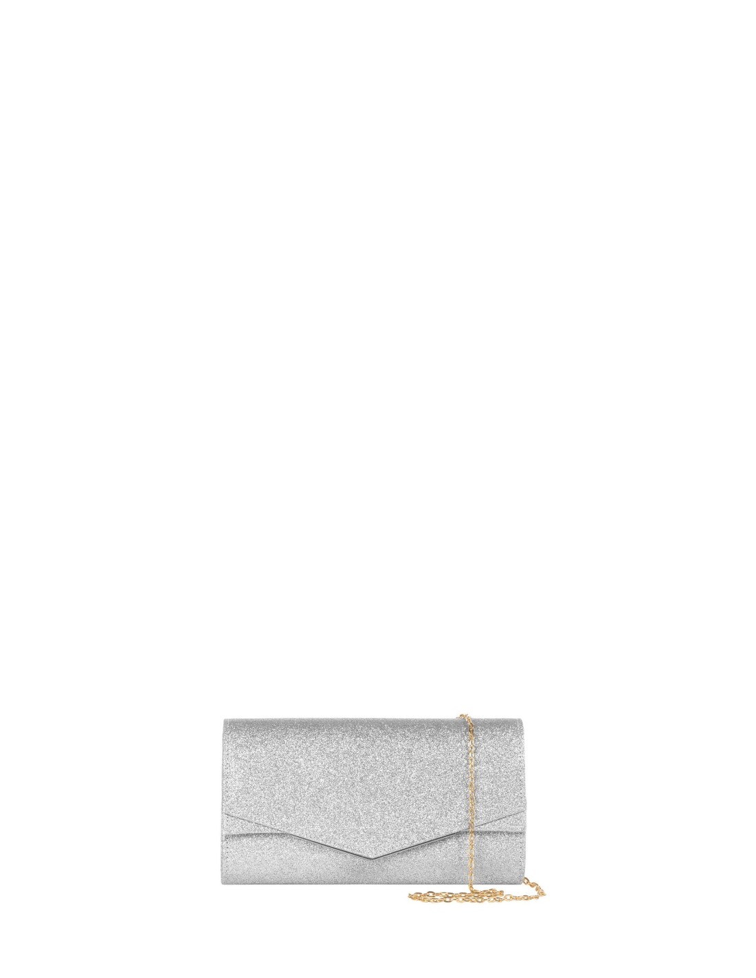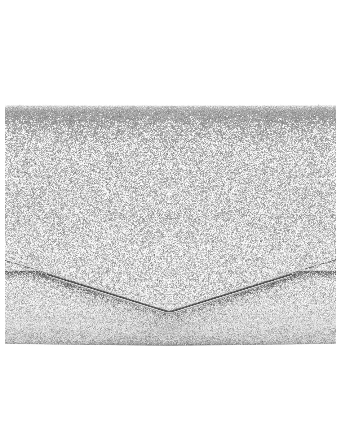 Mini mala rígida de silhueta compacta, totalmente revestida de glitter para um efeito luminoso que valoriza qualquer look de cerimónia ou festa. Aba envelope com fecho de pressão e alça de corrente interna, para usar ao ombro ou na mão para uma elegância sempre cuidada.