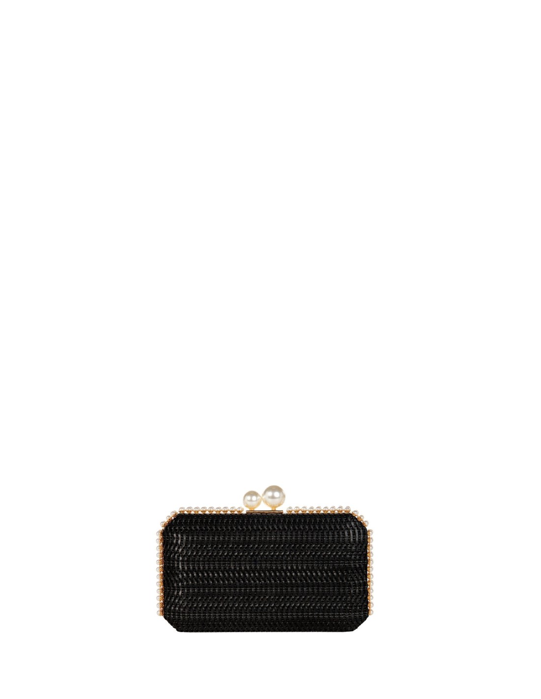 Minibag de estrutura boxy com elegante trabalho de trama inspirado na palha. A borda adornada com pérolas e o fecho tipo joia iluminam cada gesto. A cadenina destacável permite usá-la ao ombro ou na mão, ideal para festas e cerimónias.