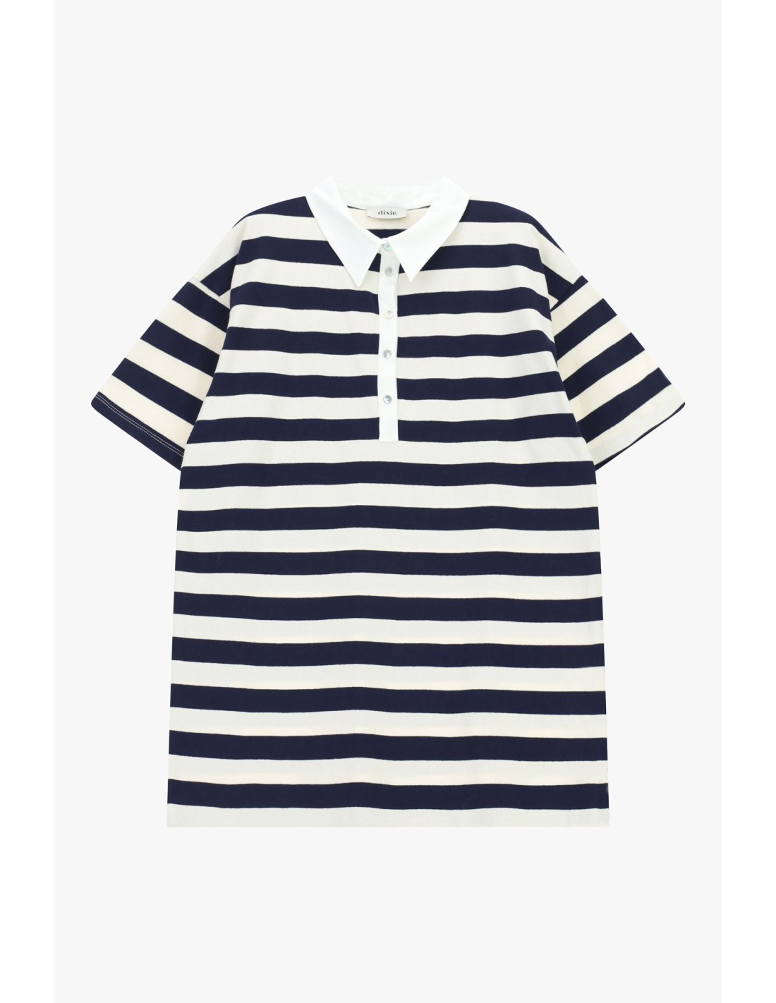 A polo às riscas com gola clássica e fecho de botões acrescenta um toque original ao guarda-roupa do dia a dia. Linhas limpas e largas criam um visual descontraído mas cuidado, perfeito para combinar com um par de jeans para os dias dinâmicos ou com saias para um efeito mais feminino e requintado.