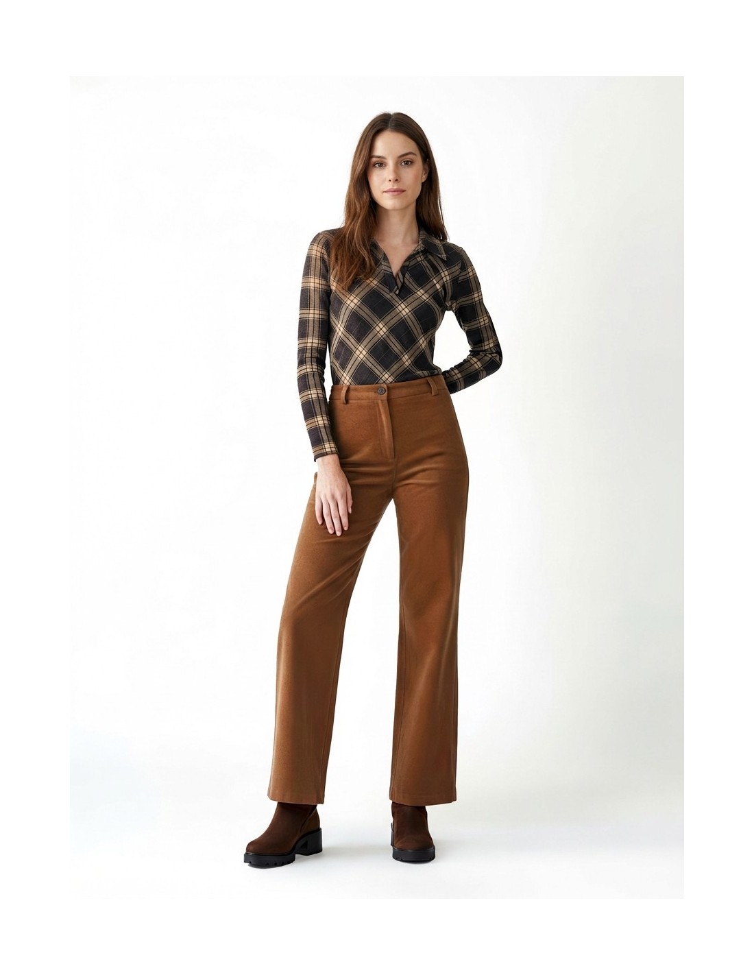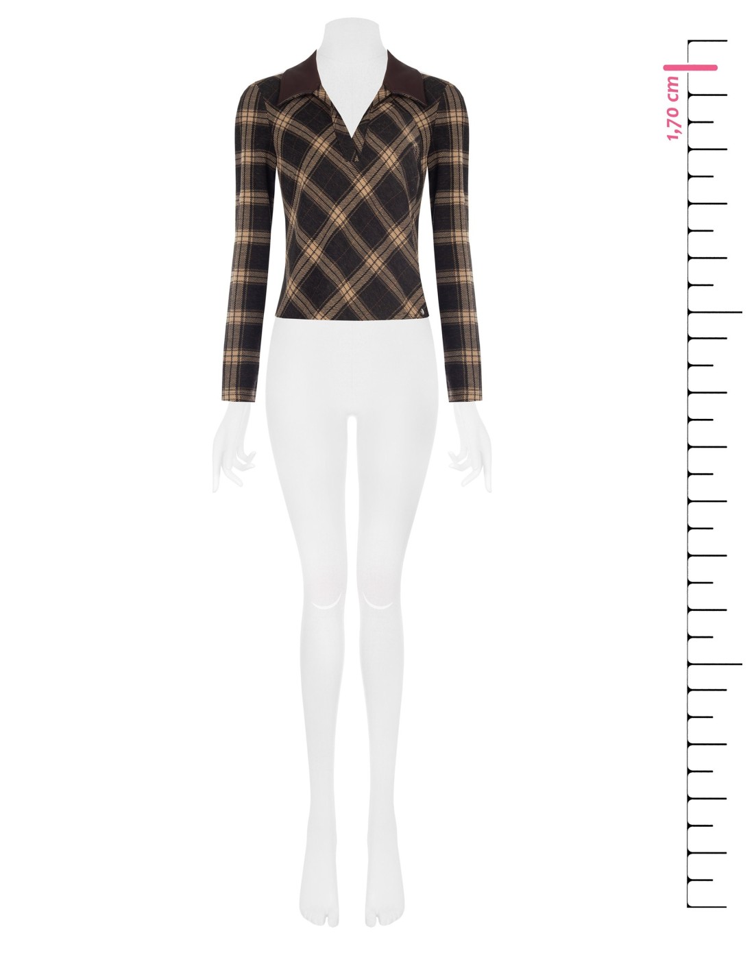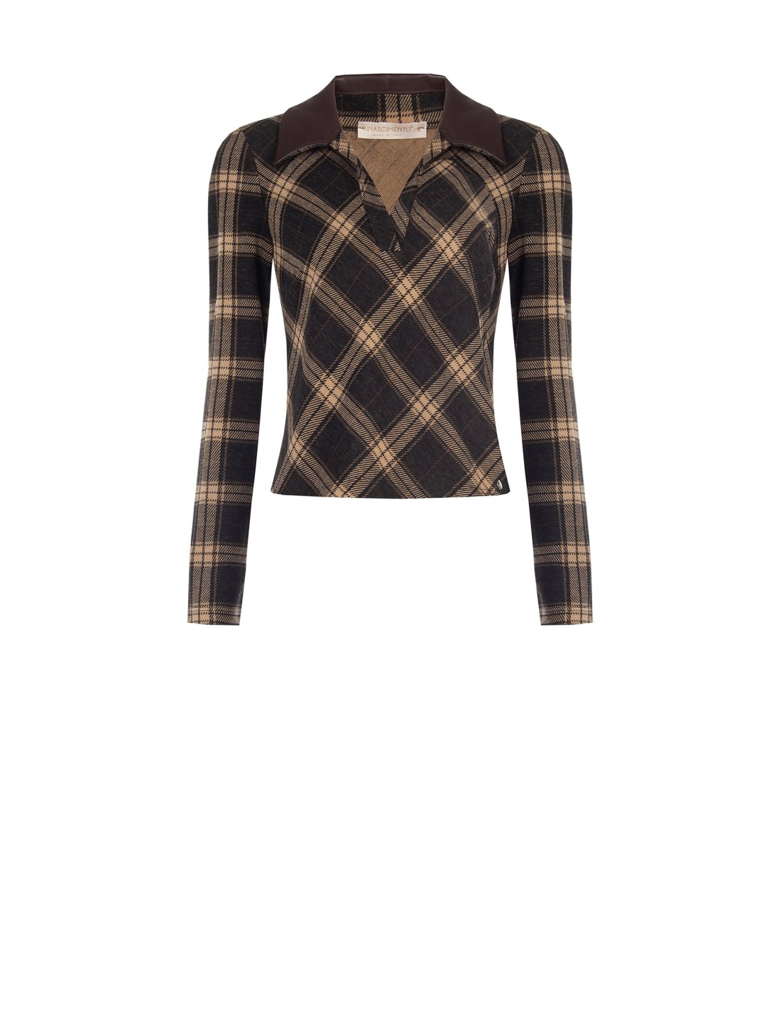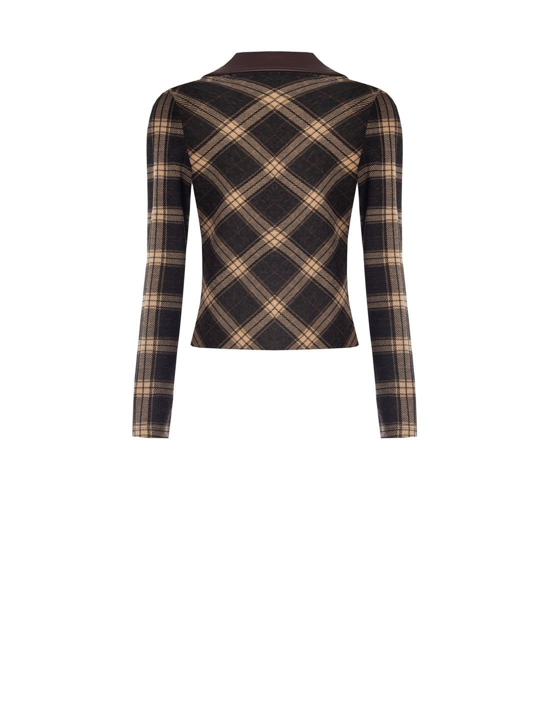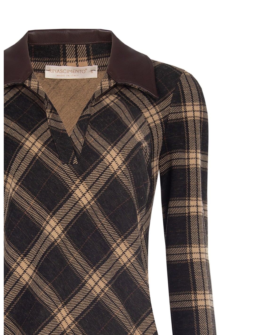 Camisola justa com corte acinturado que realça a silhueta. Confeccionada em macio jacquard com padrão tartan, oferece conforto elástico durante todo o dia. Gola em pele sintética e decote em V conferem caráter contemporâneo. Perfeita para o escritório com calças de alfaiataria ou para o dia a dia com denim. Brand: Rinascimento.
