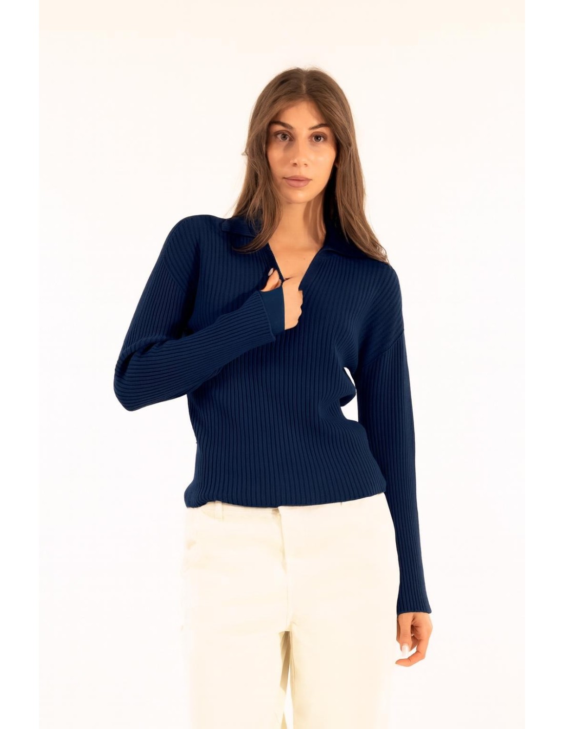 Kontatto assina uma camisola canelada com corte regular que define a silhueta sem apertar. Malha macia de trama compacta, agradável na pele. Gola com decote em V e ombros ligeiramente caídos para uma aura descontraída. Versátil: perfeita com denim para o dia a dia ou com calças de alfaiataria no escritório.