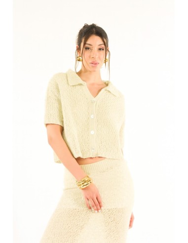Camisola curta Kontatto com um corte macio e ligeiramente boxy, que valoriza a silhueta sem apertar. Padrão perfurado em fio macio e leve. Gola de camisa e fecho frontal com botões com efeito madrepérola. Perfeita com denim ou saia coordenada para um escritório descontraído, um aperitivo ou um look quotidiano chique.