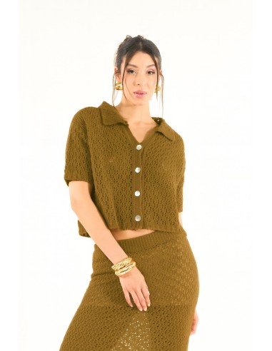 Camisola curta Kontatto com um corte macio e ligeiramente boxy, que valoriza a silhueta sem apertar. Padrão perfurado em fio macio e leve. Gola de camisa e fecho frontal com botões com efeito madrepérola. Perfeita com denim ou saia coordenada para um escritório descontraído, um aperitivo ou um look quotidiano chique.