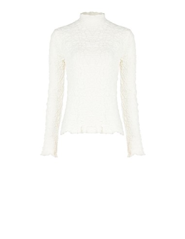 Top justo Rinascimento em mistura de algodão, macio e respirável. O trabalhado em relevo esculpe a silhueta, enquanto a gola ligeiramente alta e micro folhos nos punhos e na bainha conferem feminilidade. Fácil de conjugar por baixo de um blazer ou com denim, ideal para escritório e para o dia a dia com um toque sofisticado.