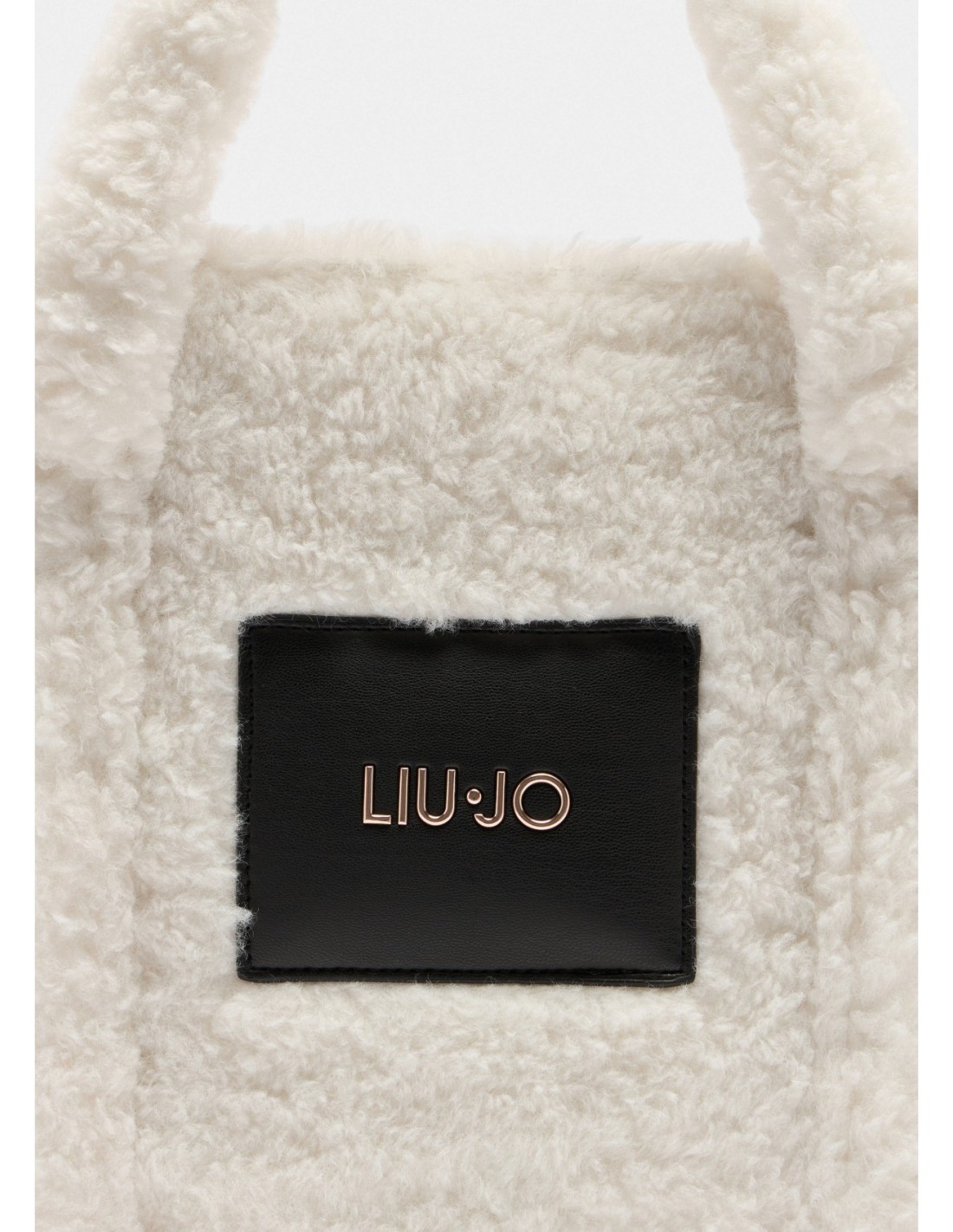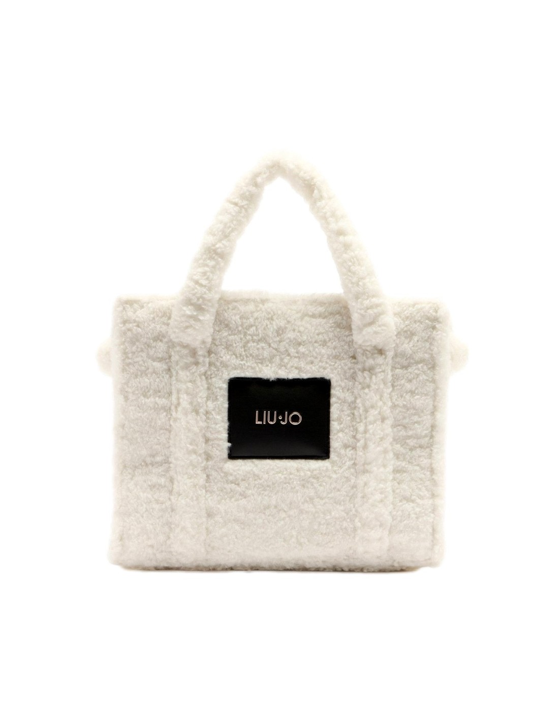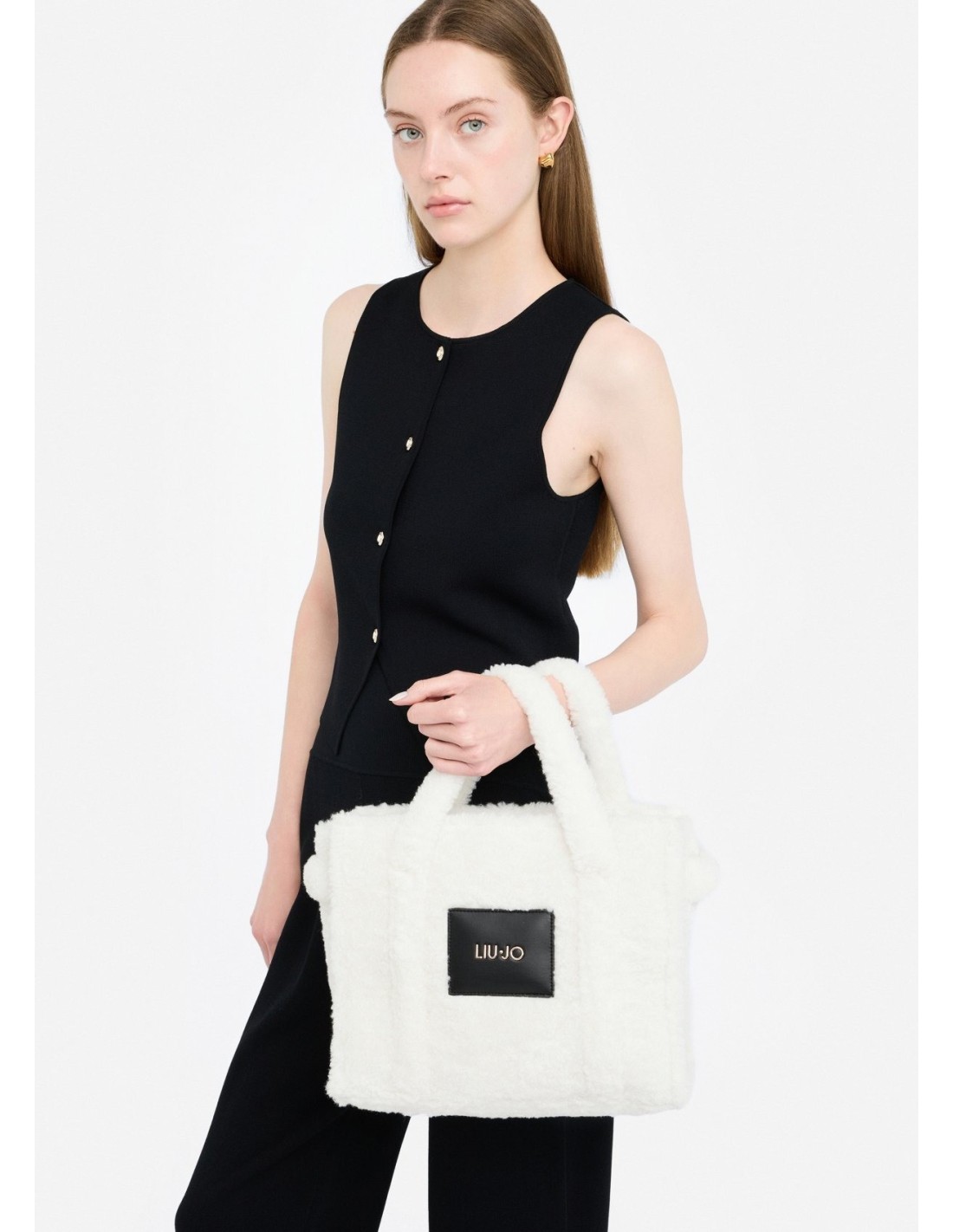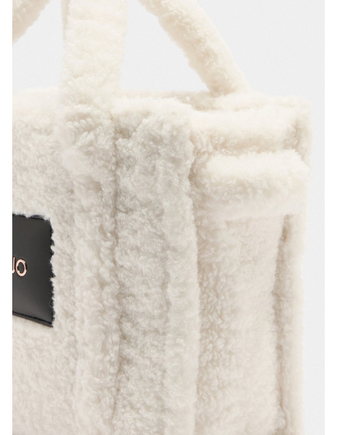 Saco de compras feito de peluche, remendo com logótipo na frente, pegas, alça de ombro ajustável, forro completo com logótipo, fecho de correr.