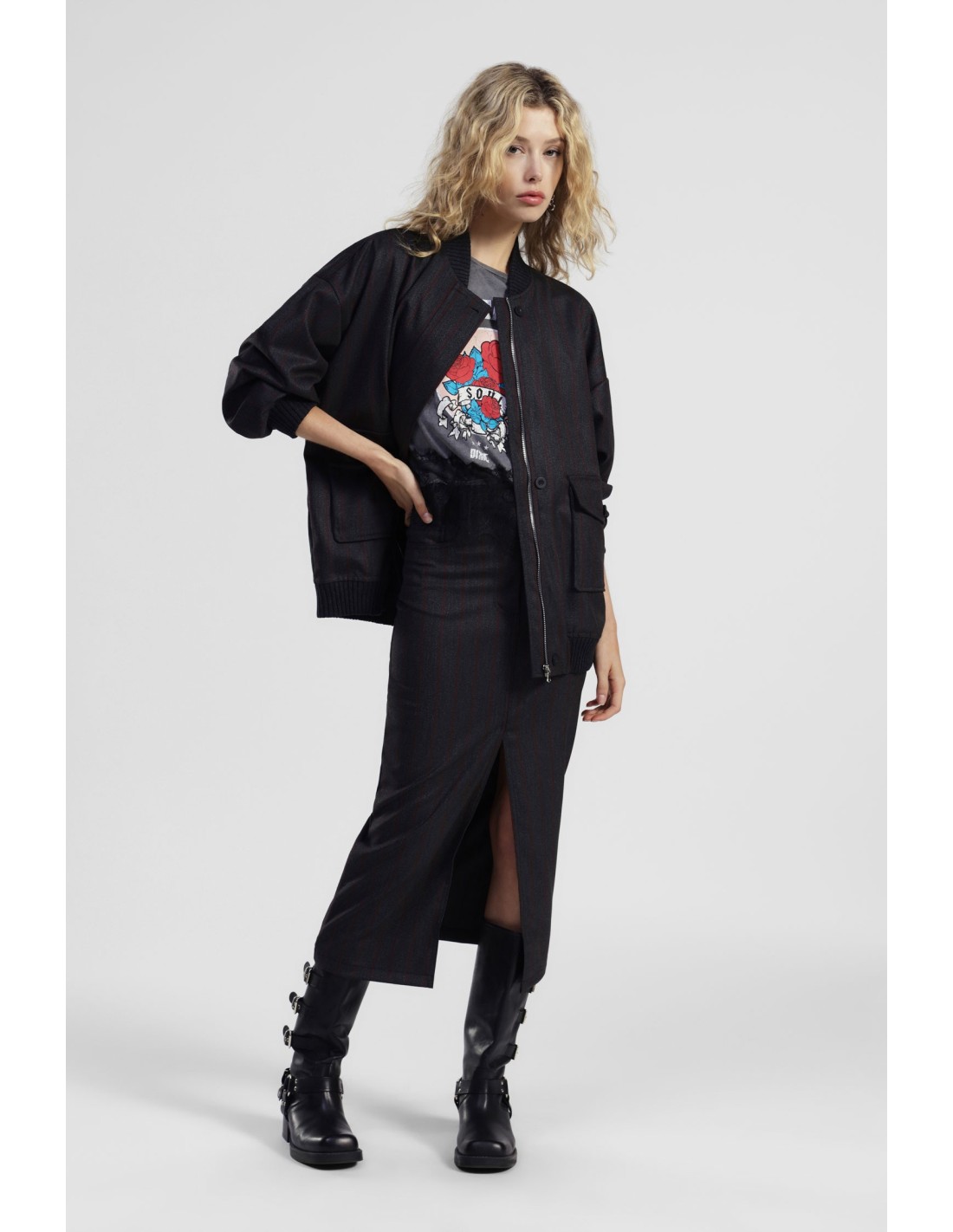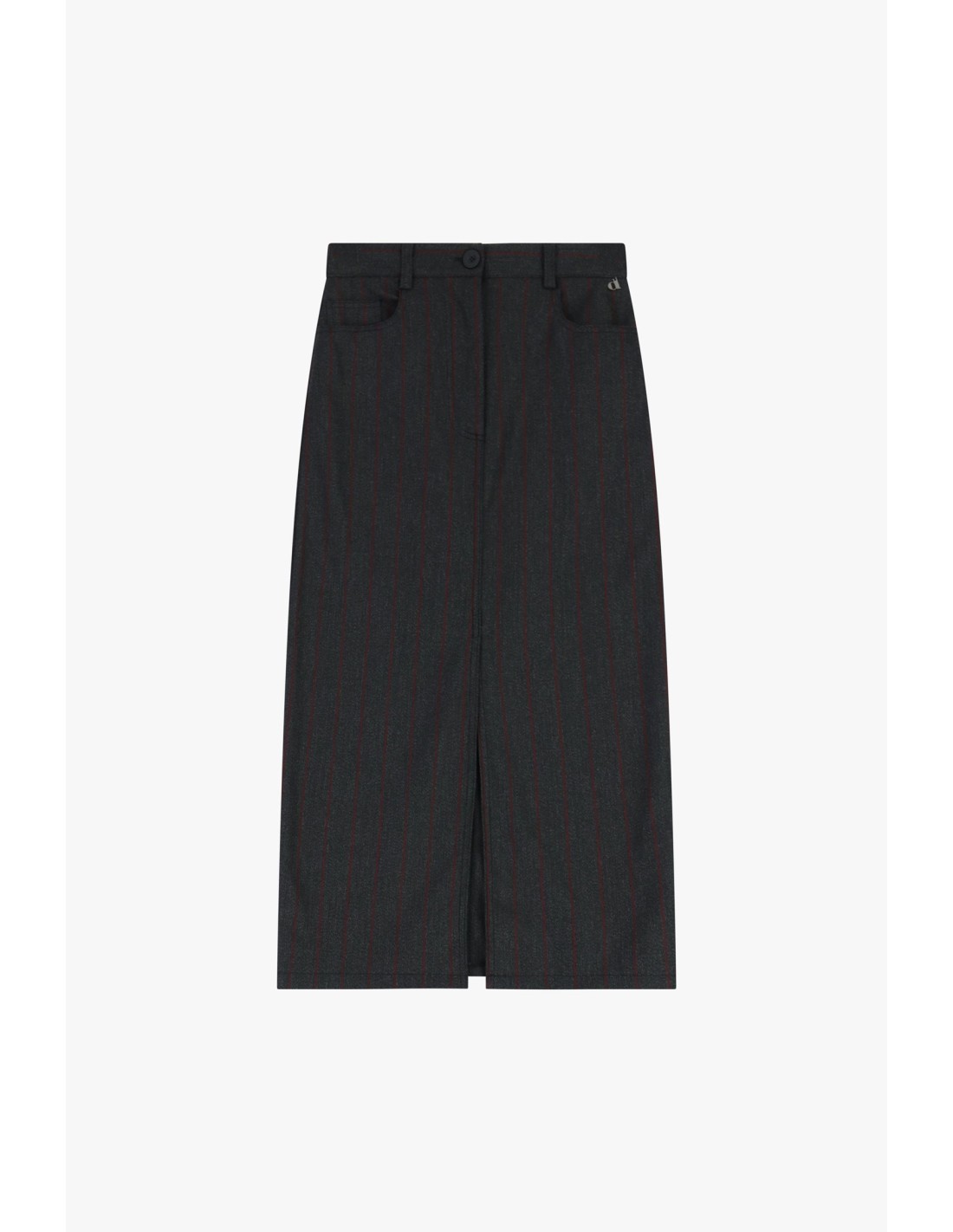 Deixe-se surpreender pelo carácter prático desta saia às riscas de corte direito, com bolsos à frente e presilhas para o cinto. A fenda central confere movimento e conforto, tornando-a perfeita para todos os seus dias. Fácil de combinar, ideal desde o trabalho até aos encontros informais.
