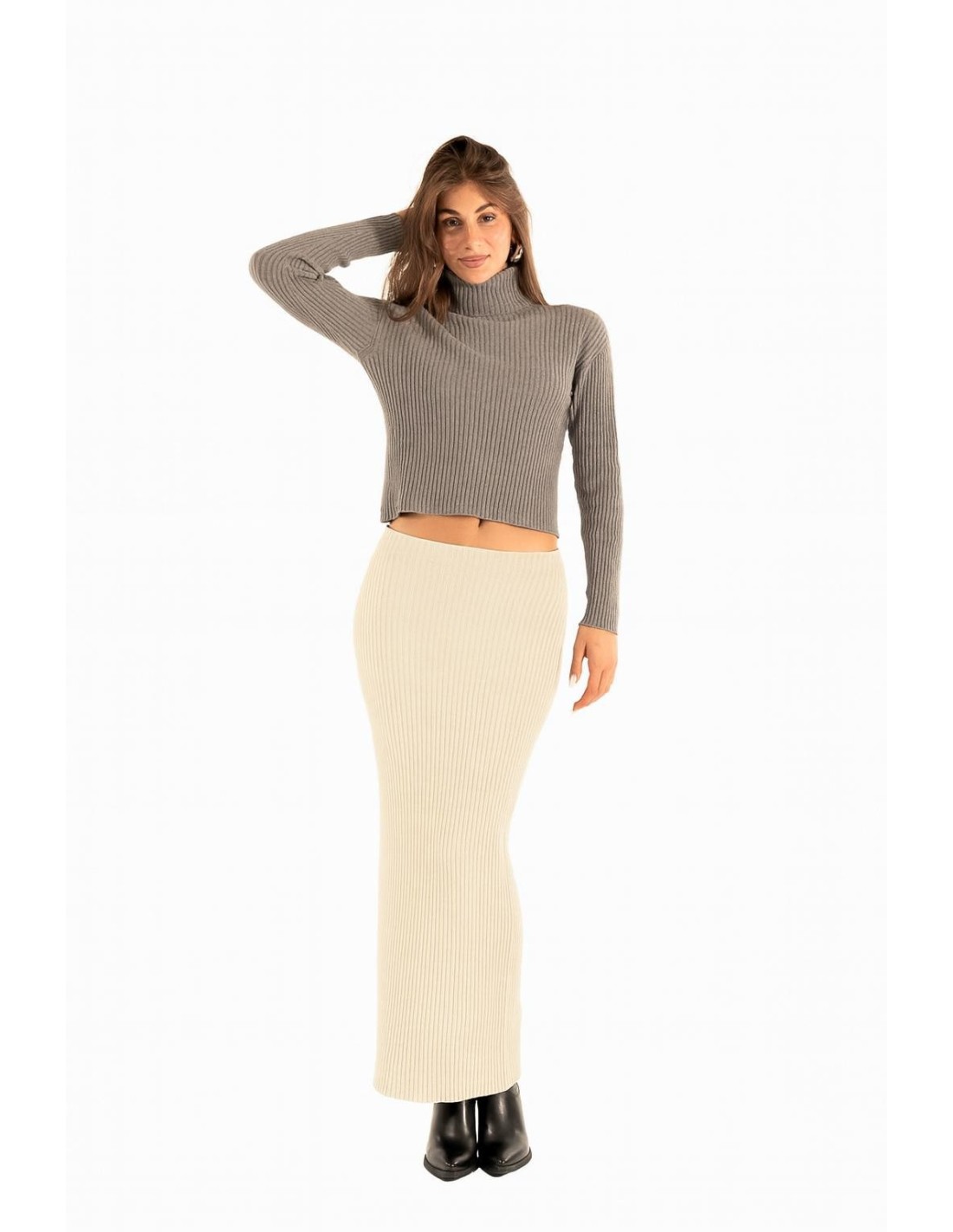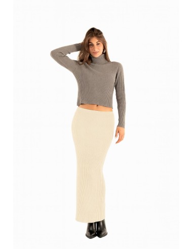 Kontatto assina uma longuete em malha canelada, corte justo e confortável que valoriza a silhueta sem apertar. Fio macio e stretch, textura compacta. Cintura elástica e fundo direito com ligeira fenda posterior para liberdade de movimentos. Perfeita do escritório ao aperitivo, também em coordenado.