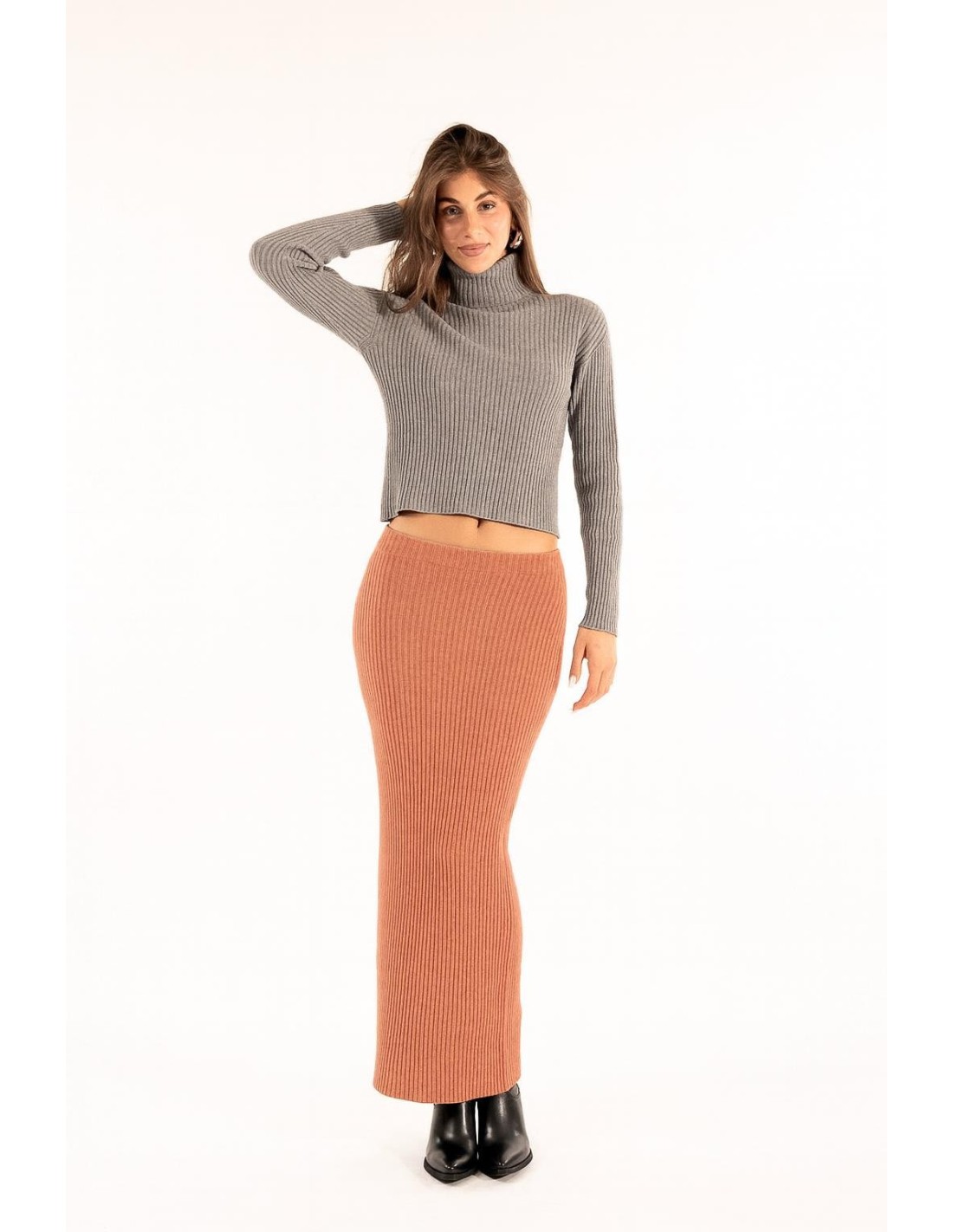 Kontatto assina uma longuete em malha canelada, corte justo e confortável que valoriza a silhueta sem apertar. Fio macio e stretch, textura compacta. Cintura elástica e fundo direito com ligeira fenda posterior para liberdade de movimentos. Perfeita do escritório ao aperitivo, também em coordenado.