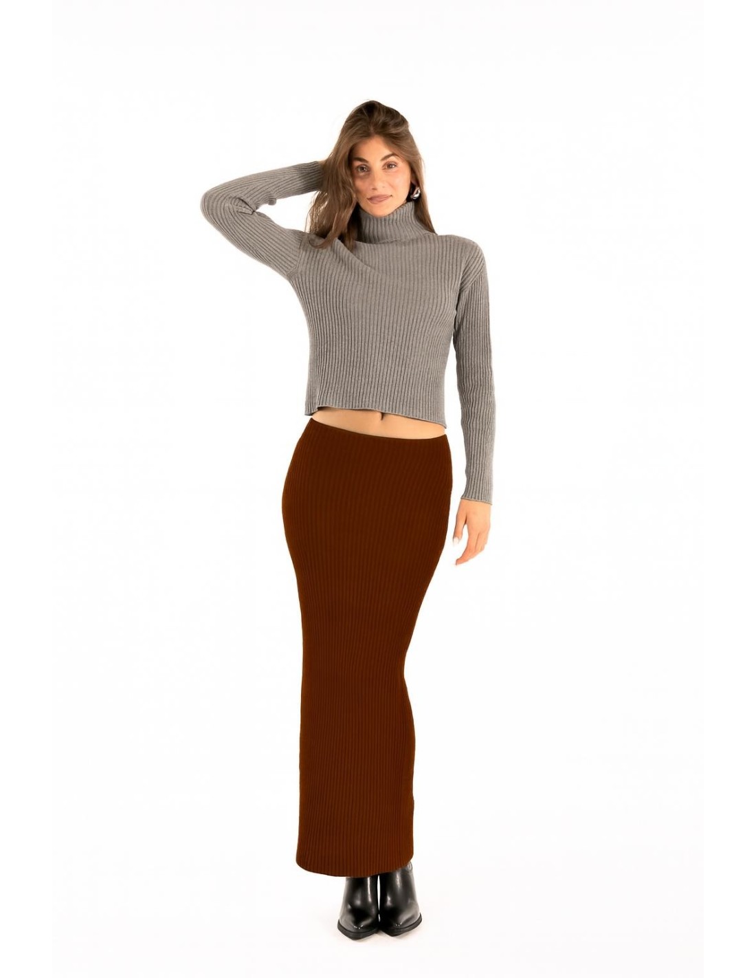 Kontatto assina uma longuete em malha canelada, corte justo e confortável que valoriza a silhueta sem apertar. Fio macio e stretch, textura compacta. Cintura elástica e fundo direito com ligeira fenda posterior para liberdade de movimentos. Perfeita do escritório ao aperitivo, também em coordenado.