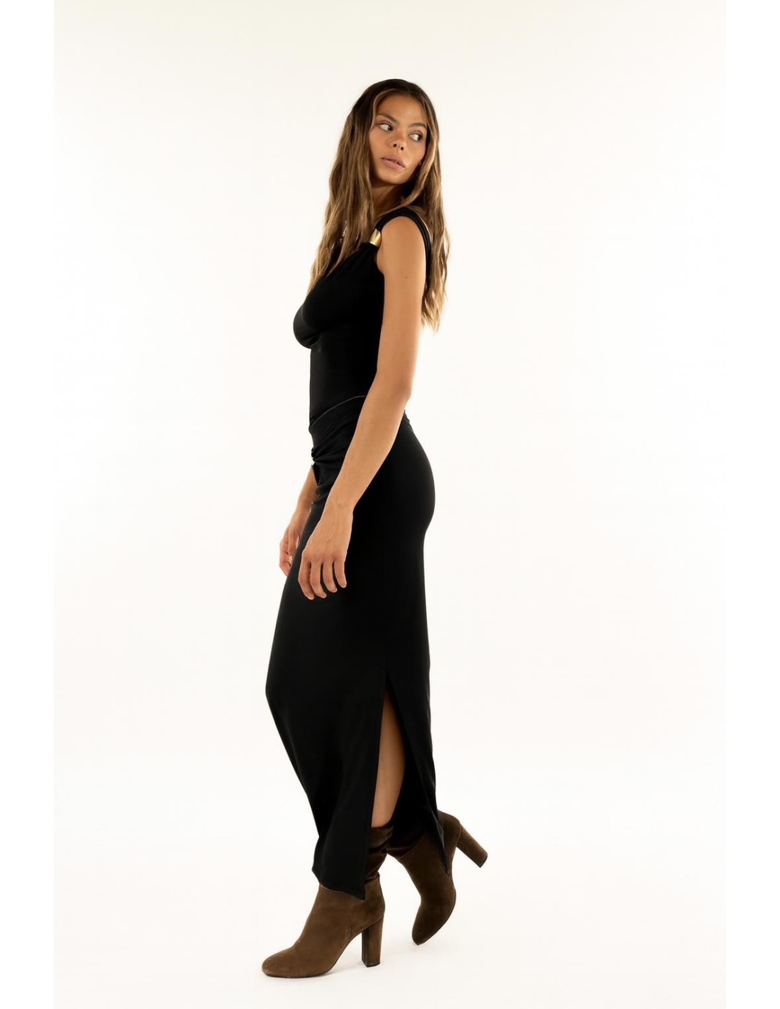 Kontatto interpreta a longuette de cintura média com um corte justo que emagrece a silhueta. Confeccionada em jersey macio e ligeiramente elástico, desliza fluidamente sobre a pele. Pormenor frontal drapeado com inserções metálicas e fenda lateral para liberdade de movimentos. Perfeito desde o escritório até à hora do cocktail.