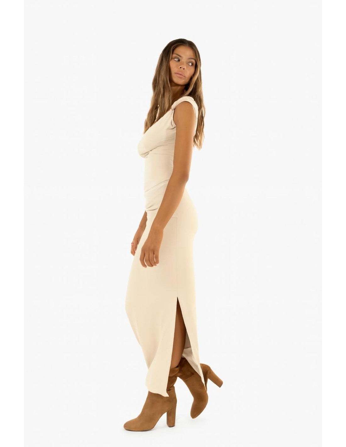 Kontatto interpreta a longuette de cintura média com um corte justo que emagrece a silhueta. Confeccionada em jersey macio e ligeiramente elástico, desliza fluidamente sobre a pele. Pormenor frontal drapeado com inserções metálicas e fenda lateral para liberdade de movimentos. Perfeito desde o escritório até à hora do cocktail.