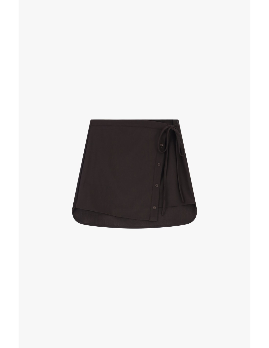 Saia curta num estilo essencial com fecho de botões visível à frente e pormenor de nó lateral que lhe confere um toque de originalidade. O corte ligeiramente arredondado na bainha torna-a versátil para qualquer ocasião, adaptando-se tanto a looks casuais como a looks mais sofisticados. Fácil de usar e combinar, perfeito para se sentir sempre confortável.