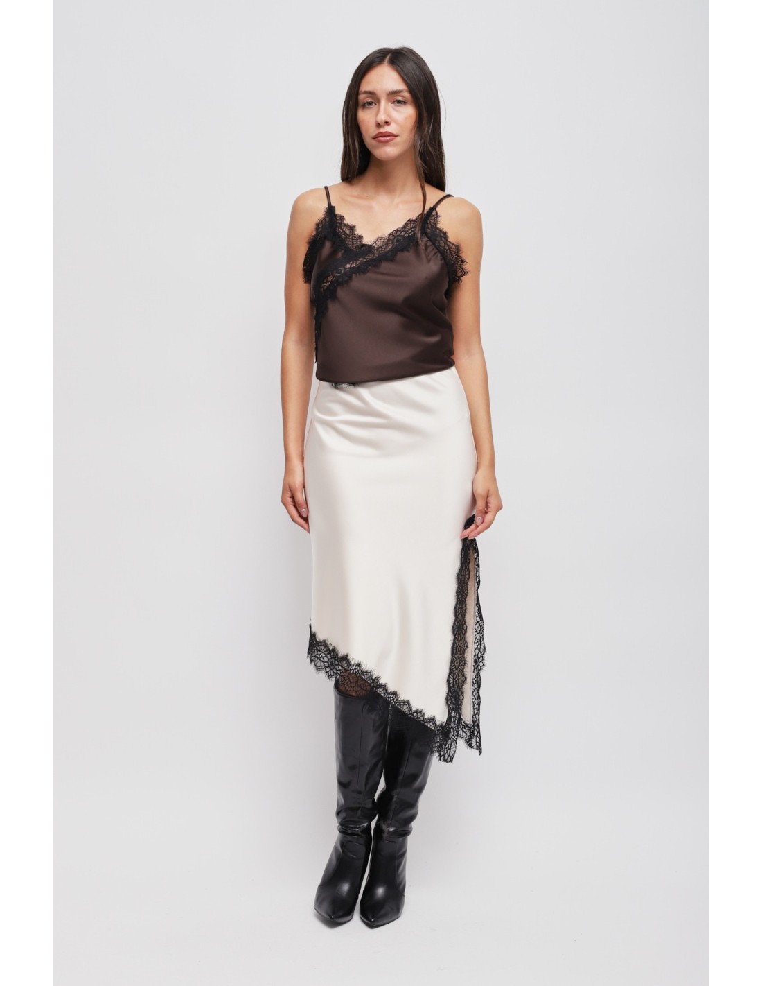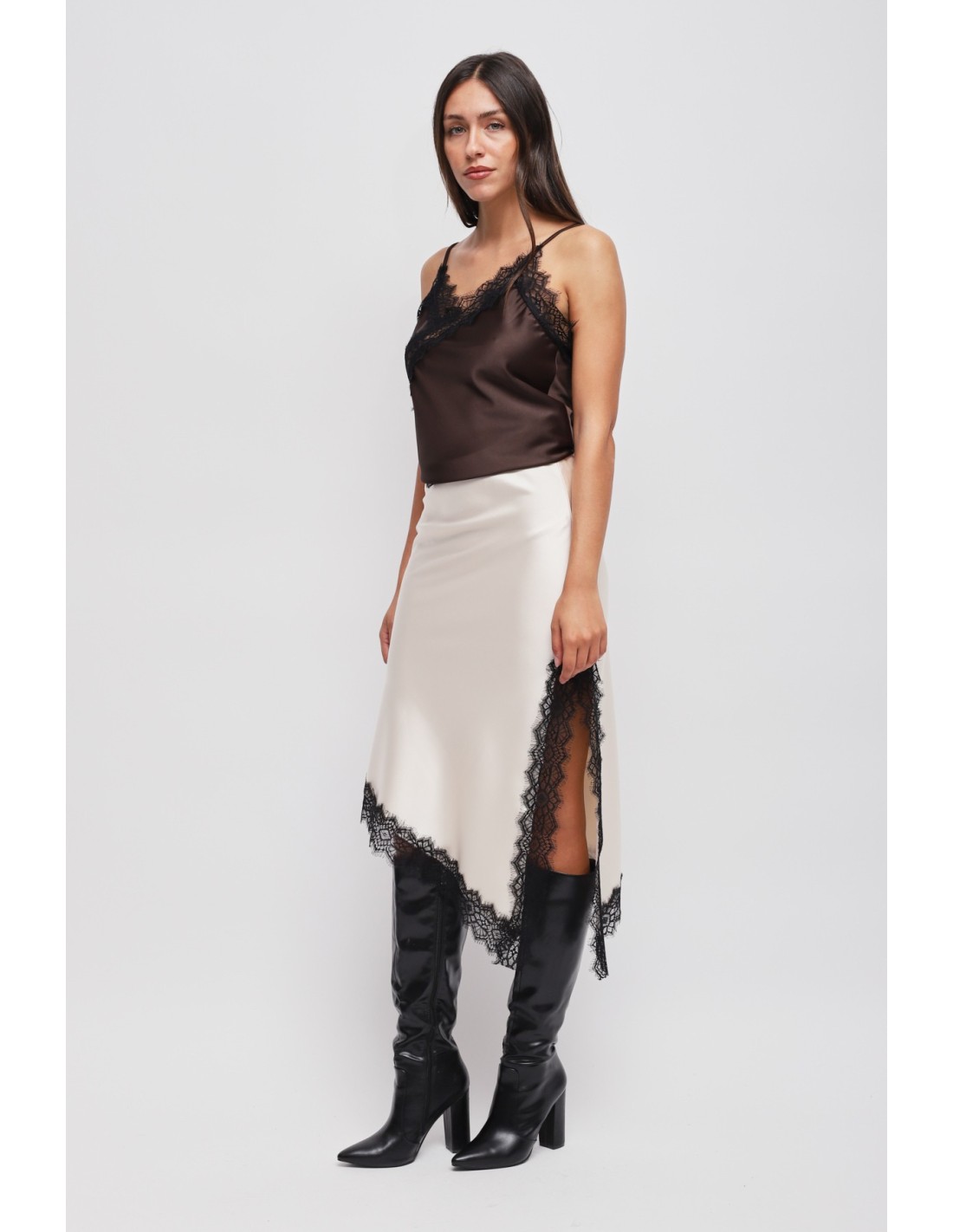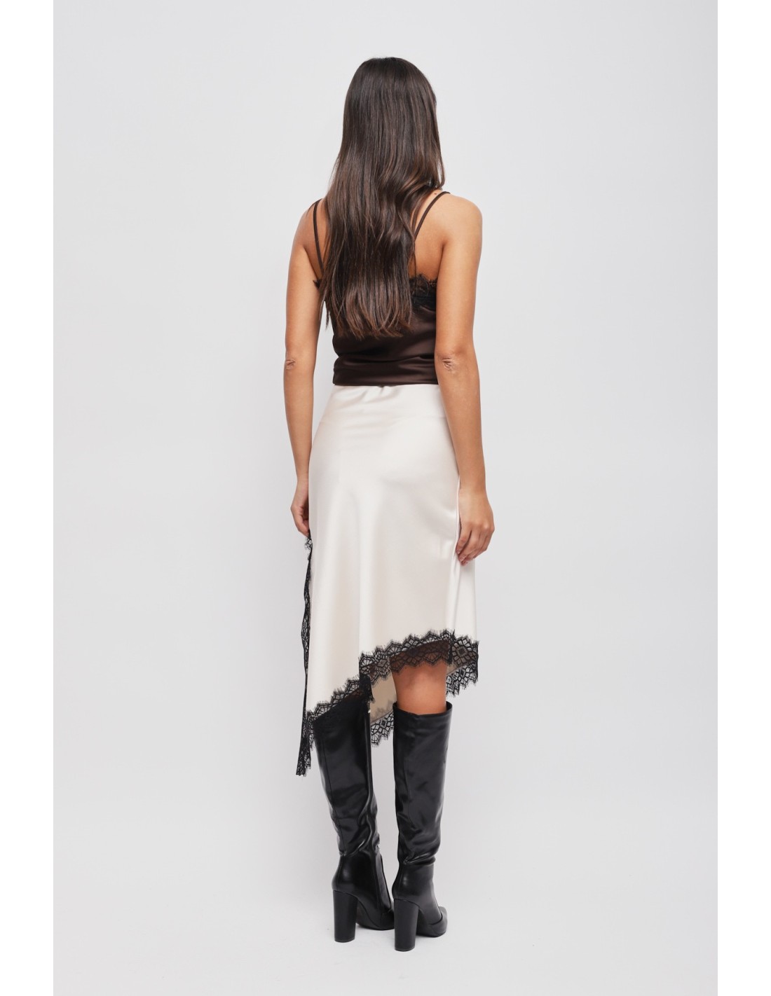 Saia em cetim com bainha assimétrica e renda Maryley