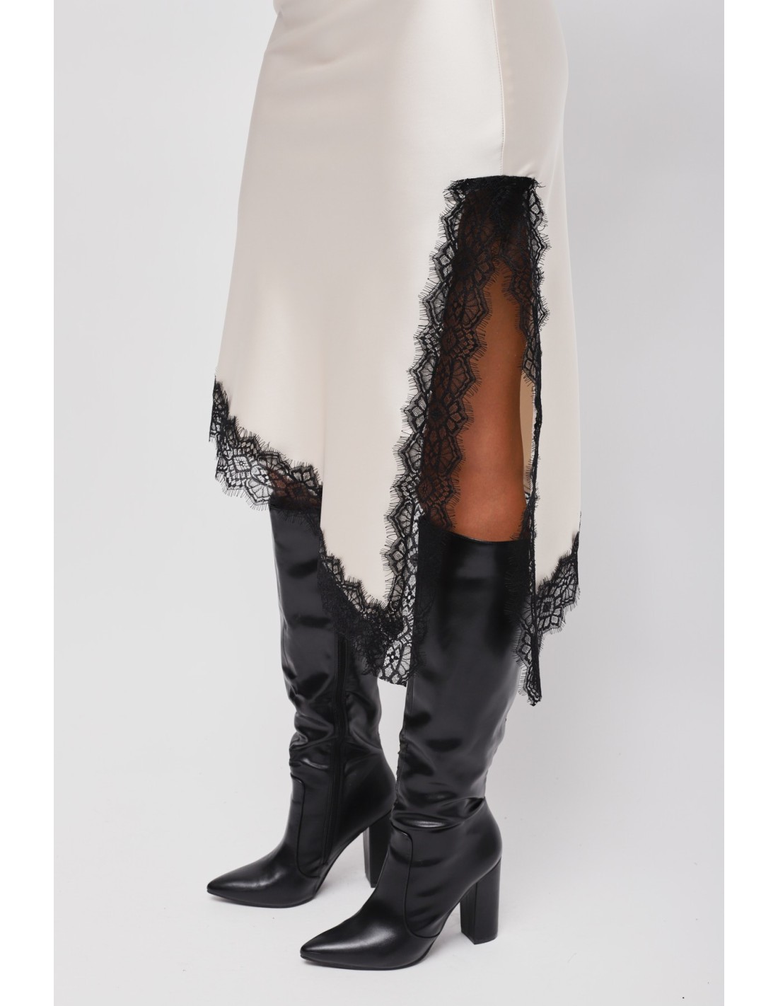 Saia em cetim com barra assimétrica e renda Maryley