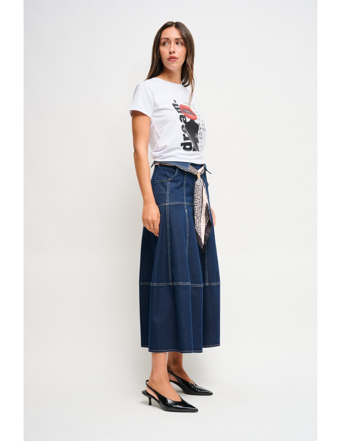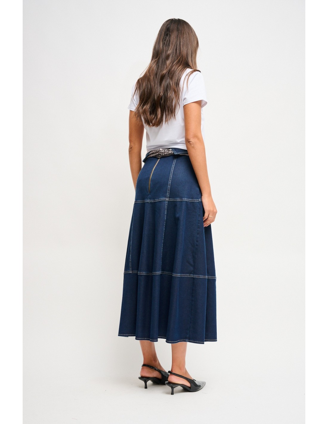 Maryley apresenta uma saia midi trapézio de corte fluido e feminino. Denim resistente mas confortável, costuras à vista que alongam a silhueta. Cintura com lenço removível e bolsos laterais para maior praticidade. Versátil para o dia: perfeita com t-shirt num escritório casual ou com sandálias para o fim de semana.