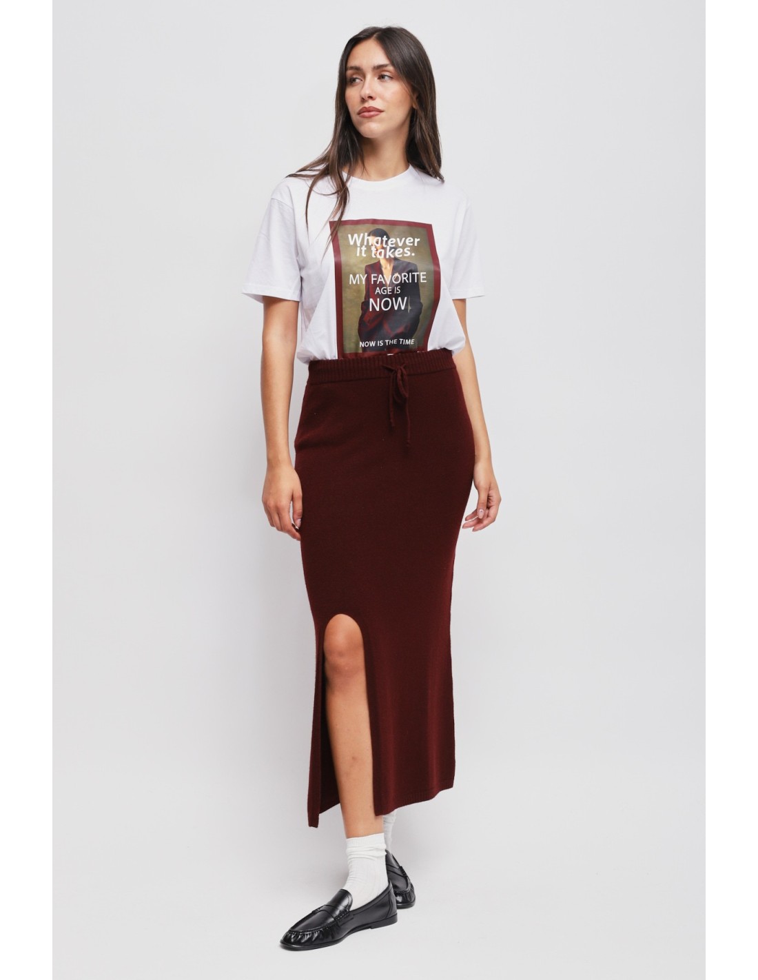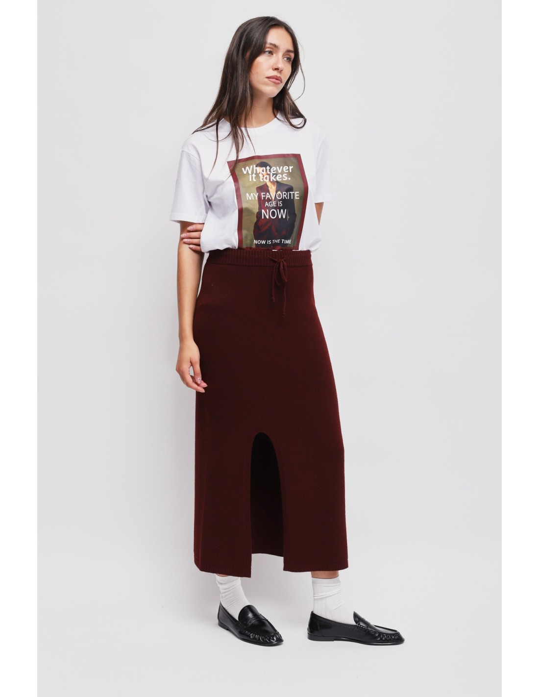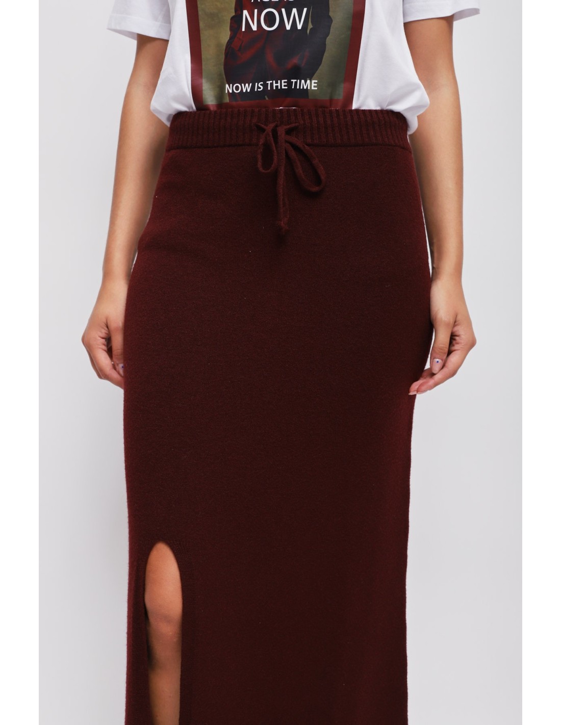 Maryley assina uma saia midi com um fit justo mas confortável. Malha macia e envolvente, cintura elástica com cordão para um ajuste sob medida. Fenda frontal que alonga a silhueta e rebordo canelado. Versátil do escritório ao fim de semana: com mocassins para o trabalho, com botas para o aperitivo.