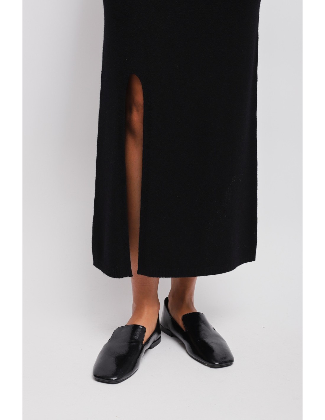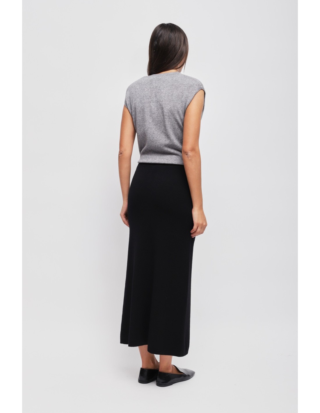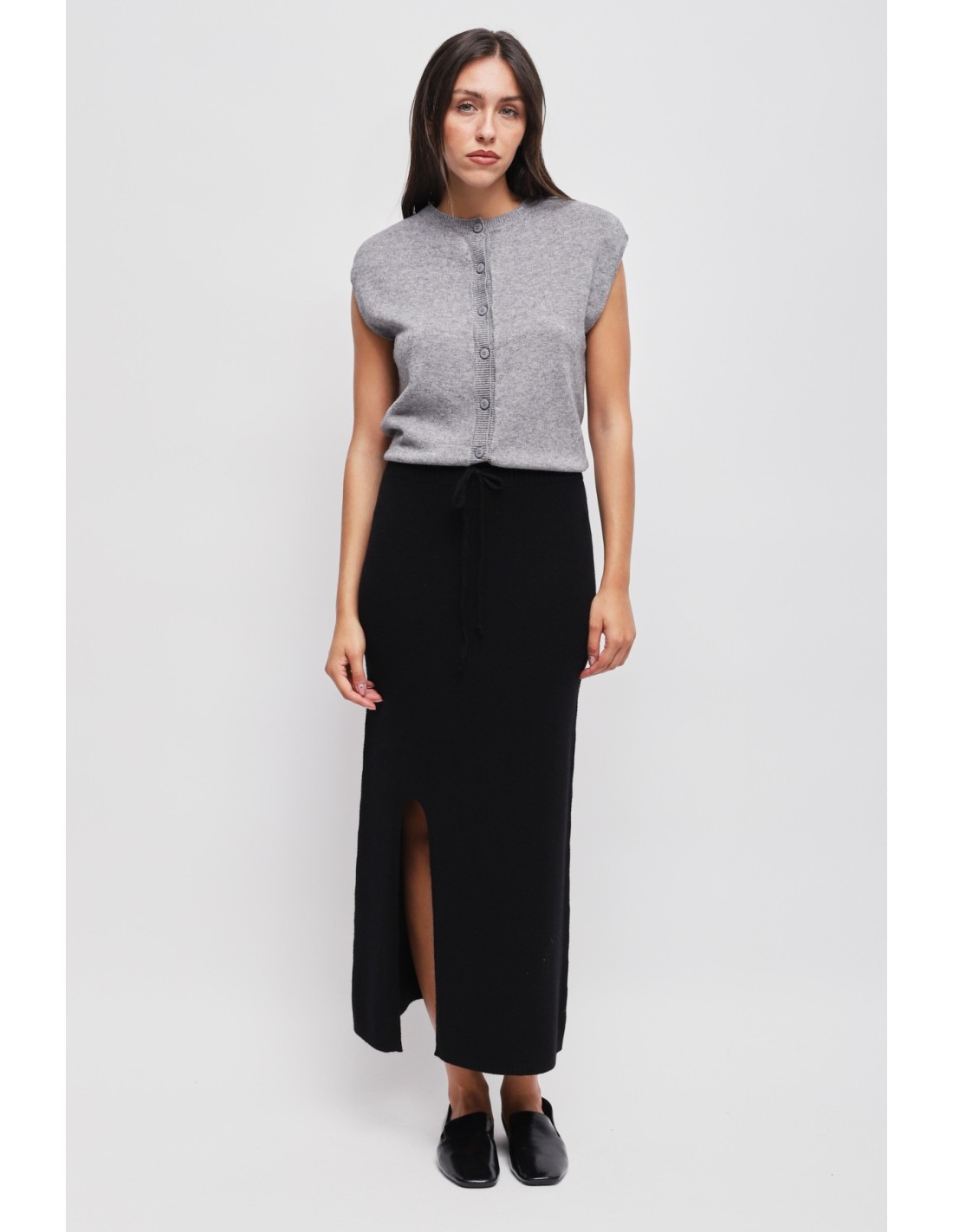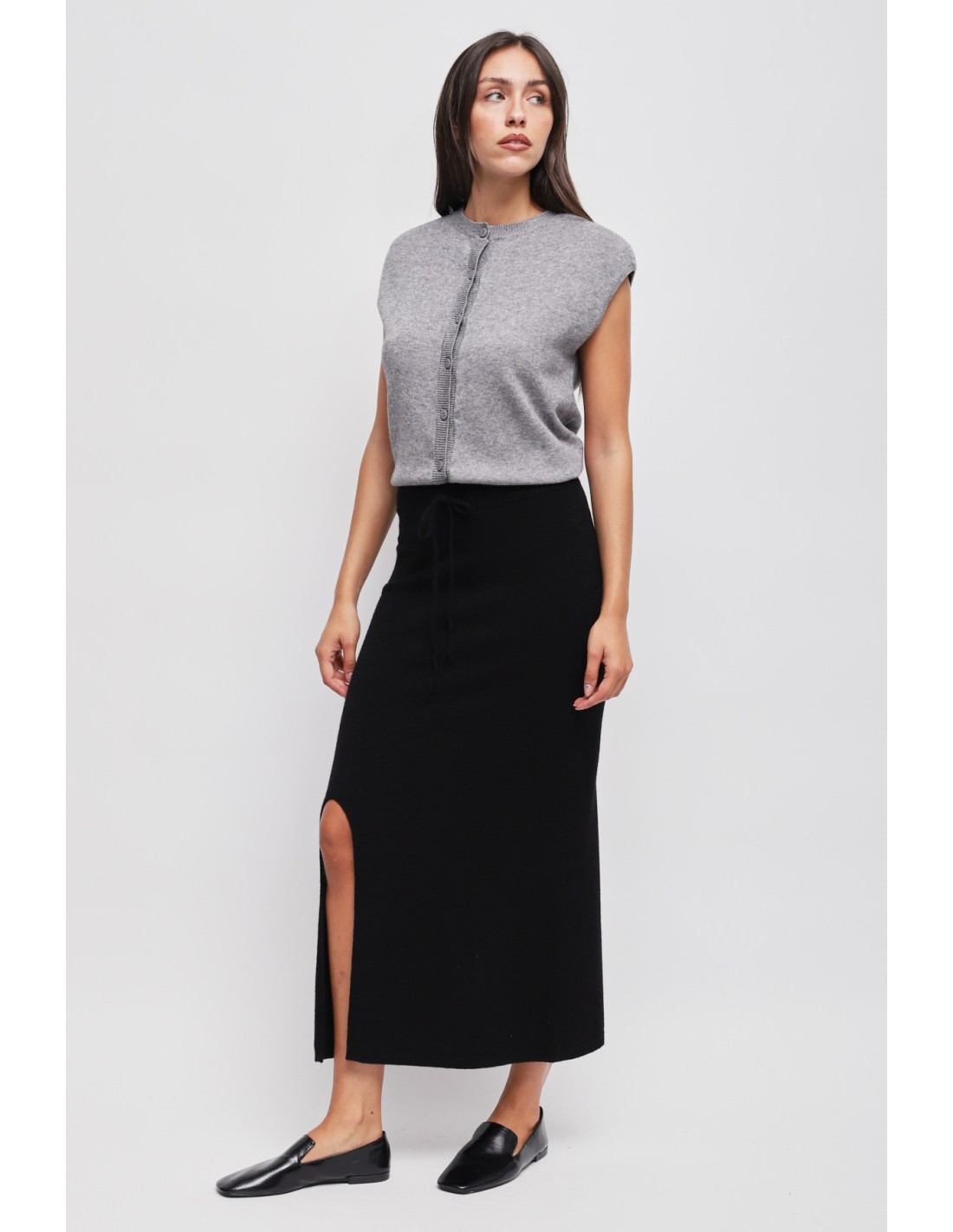 Maryley assina uma saia midi com um fit justo mas confortável. Malha macia e envolvente, cintura elástica com cordão para um ajuste sob medida. Fenda frontal que alonga a silhueta e rebordo canelado. Versátil do escritório ao fim de semana: com mocassins para o trabalho, com botas para o aperitivo.