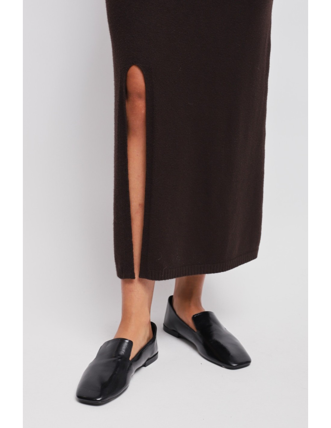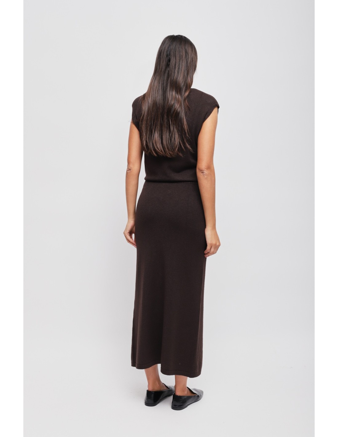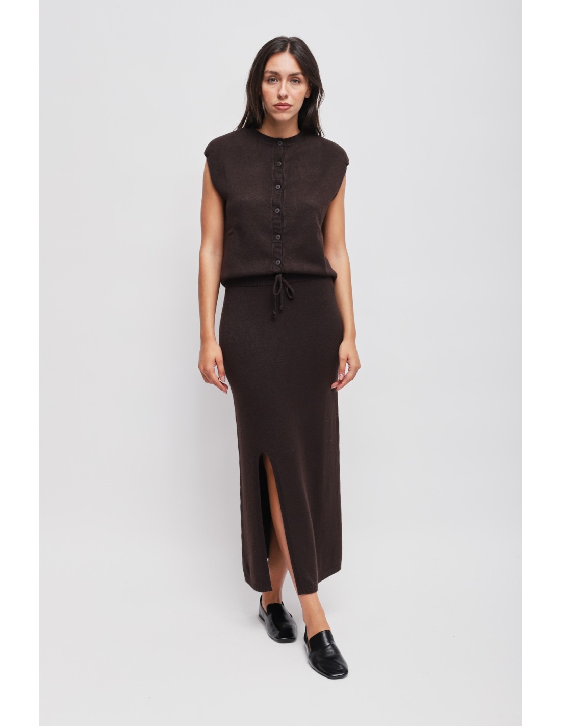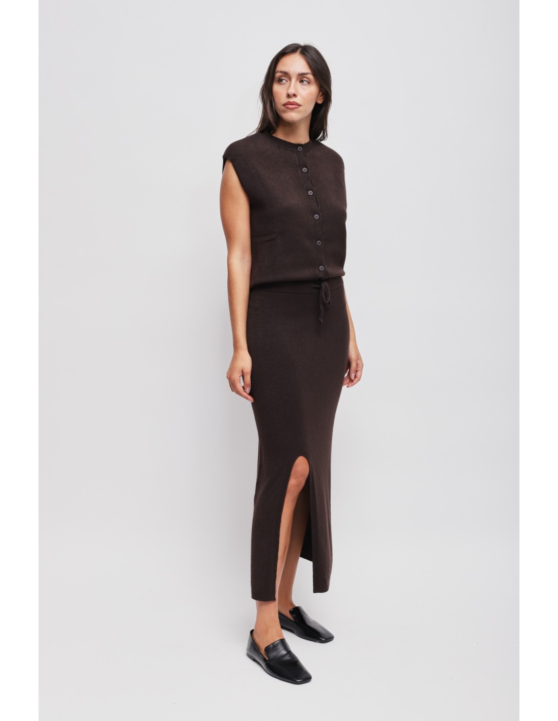 Maryley assina uma saia midi com um fit justo mas confortável. Malha macia e envolvente, cintura elástica com cordão para um ajuste sob medida. Fenda frontal que alonga a silhueta e rebordo canelado. Versátil do escritório ao fim de semana: com mocassins para o trabalho, com botas para o aperitivo.