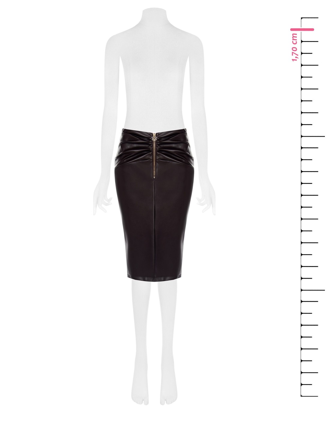 Midi de corte justo que valoriza a silhueta com conforto nos movimentos. A textura em pele sintética com efeito macio confere personalidade, enquanto o drapeado na cintura e o fecho éclair frontal decorativo acrescentam um toque sofisticado. Perfeita do escritório ao afterwork, até a um look para jantar.