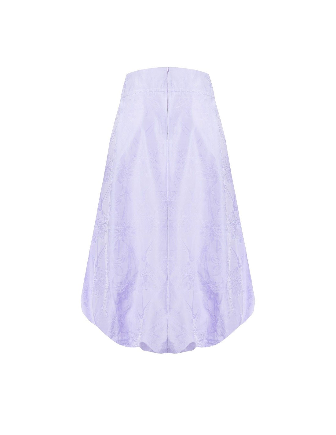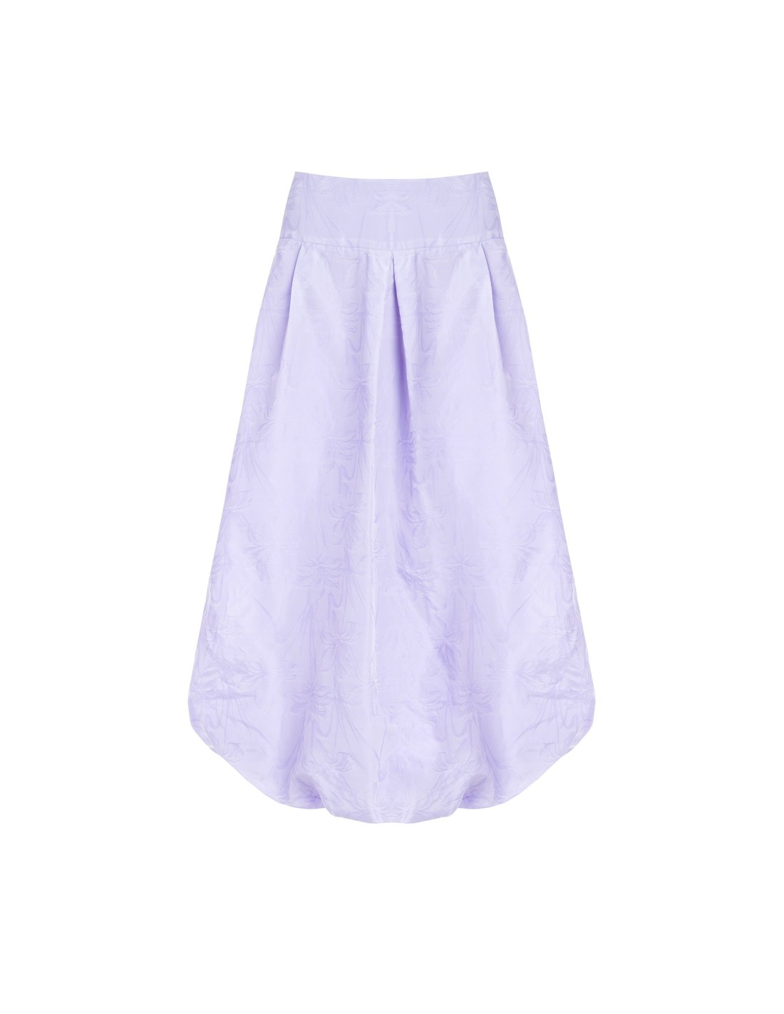 Linha longa e volume suave para uma saia de corte amplo que valoriza a cintura e acompanha os movimentos com conforto. O tecido jacquard acetinado confere profundidade, enquanto a maxi prega frontal e a bainha arredondada a tornam perfeita para festas, cerimónias ou looks especiais de noite.