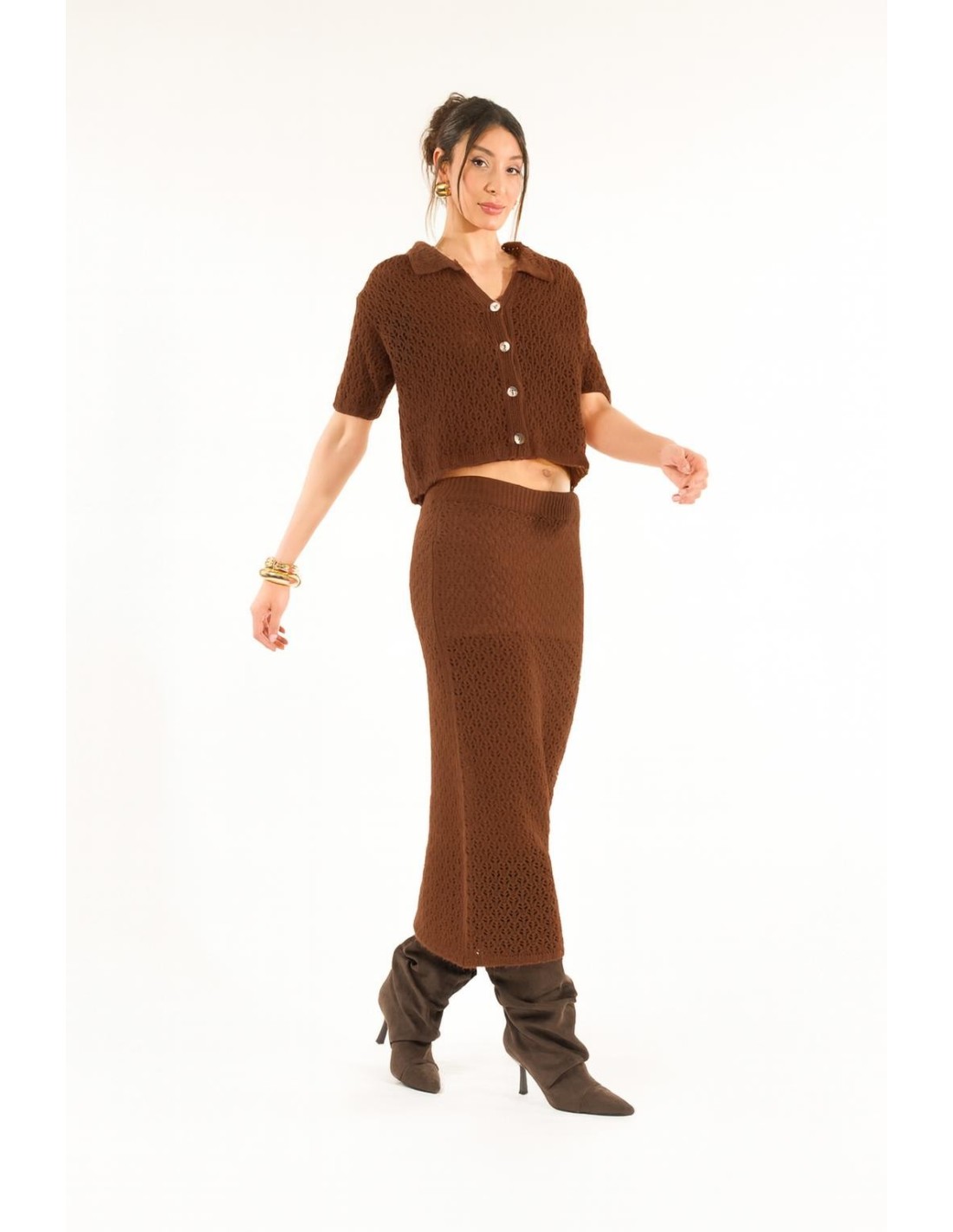 Kontatto assina uma saia midi de malha com um corte justo e confortável. Malha vazada macia com toque ligeiramente felpudo, elastizada na cintura para seguir a silhueta sem a apertar. Borda acabada e jogo de transparências que alonga. Perfeita do escritório ao aperitivo, com botas ou sandálias.