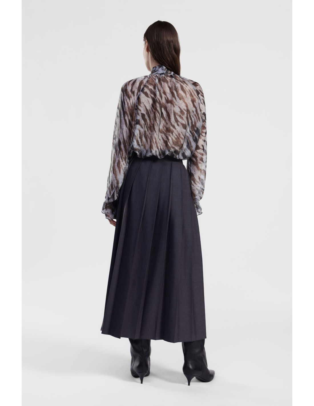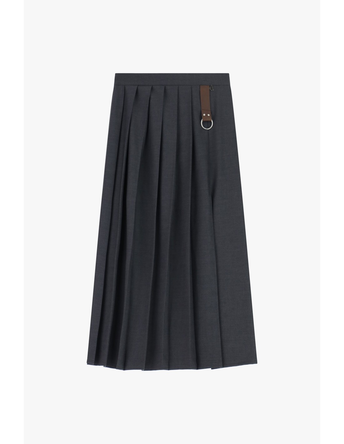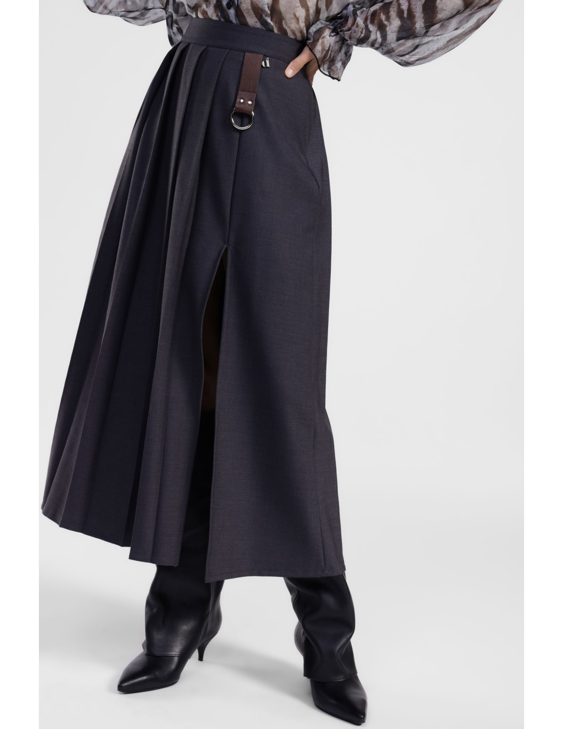 Saia plissada, perfeita para dar movimento e personalidade ao seu look quotidiano. A tira decorativa com argola metálica dá um toque original. A silhueta midi valoriza todas as silhuetas, permitindo-lhe sentir-se confortável em todas as ocasiões, do trabalho ao lazer.